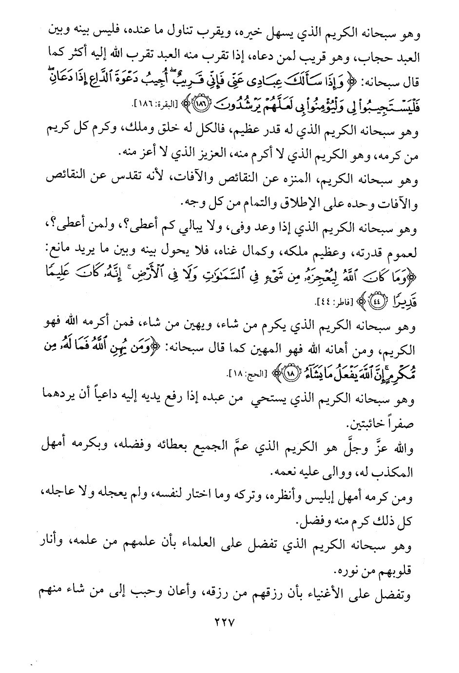 وهو سبحانه الكريم الذي يسهل خيره، ويقرب تناول ما عنده، فليس بينه وبين العبد حجاب، وهو قريب لمن دعاه، إذا تقرب منه العبد تقرب الله إليه أكثر كما قال سبحانه: {وَإِذَا سَأَلَكَ عِبَادِي عَنِّي فَإِنِّي قَرِيبٌ أُجِيبُ دَعْوَةَ الدَّاعِ إِذَا دَعَانِ فَلْيَسْتَجِيبُوا لِي وَلْيُؤْمِنُوا بِي لَعَلَّهُمْ يَرْشُدُونَ (186)} [البقرة: 186].