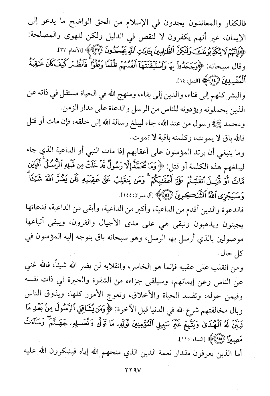وما ينبغي أن يرتد المؤمنون على أعقابهم إذا مات النبي أو الداعية الذي جاء ليبلغهم هذه الكلمة أو قتل: {وَمَا مُحَمَّدٌ إِلَّا رَسُولٌ قَدْ خَلَتْ مِنْ قَبْلِهِ الرُّسُلُ أَفَإِنْ مَاتَ أَوْ قُتِلَ انْقَلَبْتُمْ عَلَى أَعْقَابِكُمْ وَمَنْ يَنْقَلِبْ عَلَى عَقِبَيْهِ فَلَنْ يَضُرَّ اللَّهَ شَيْئًا وَسَيَجْزِي اللَّهُ الشَّاكِرِينَ (144)} [آل عمران: 144].