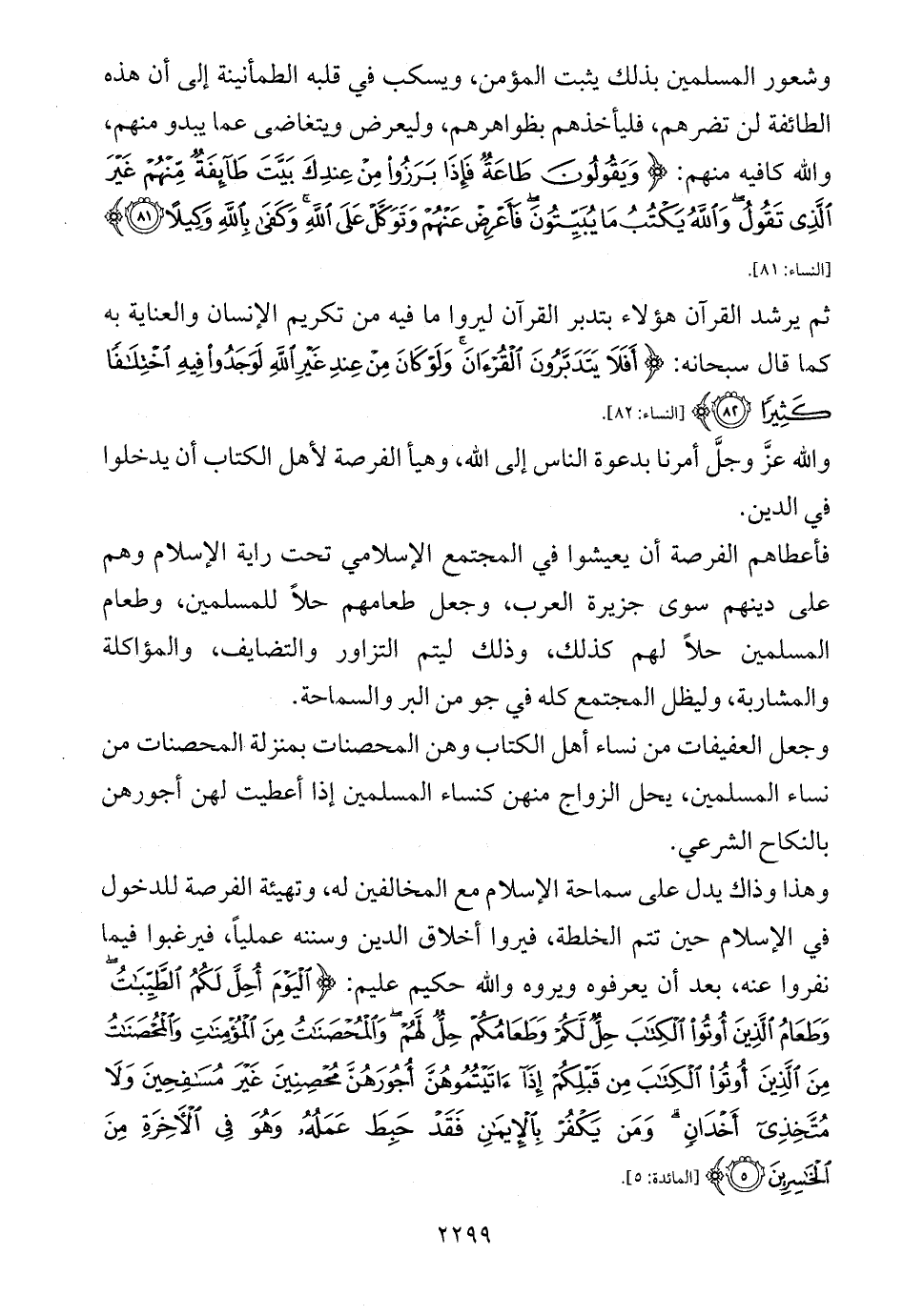 فأعطاهم الفرصة أن يعيشوا في المجتمع الإسلامي تحت راية الإسلام وهم على دينهم سوى جزيرة العرب، وجعل طعامهم حلاً للمسلمين، وطعام المسلمين حلاً لهم كذلك، وذلك ليتم التزاور والتضايف، والمؤاكلة والمشاربة، وليظل المجتمع كله في جو من البر والسماحة.
