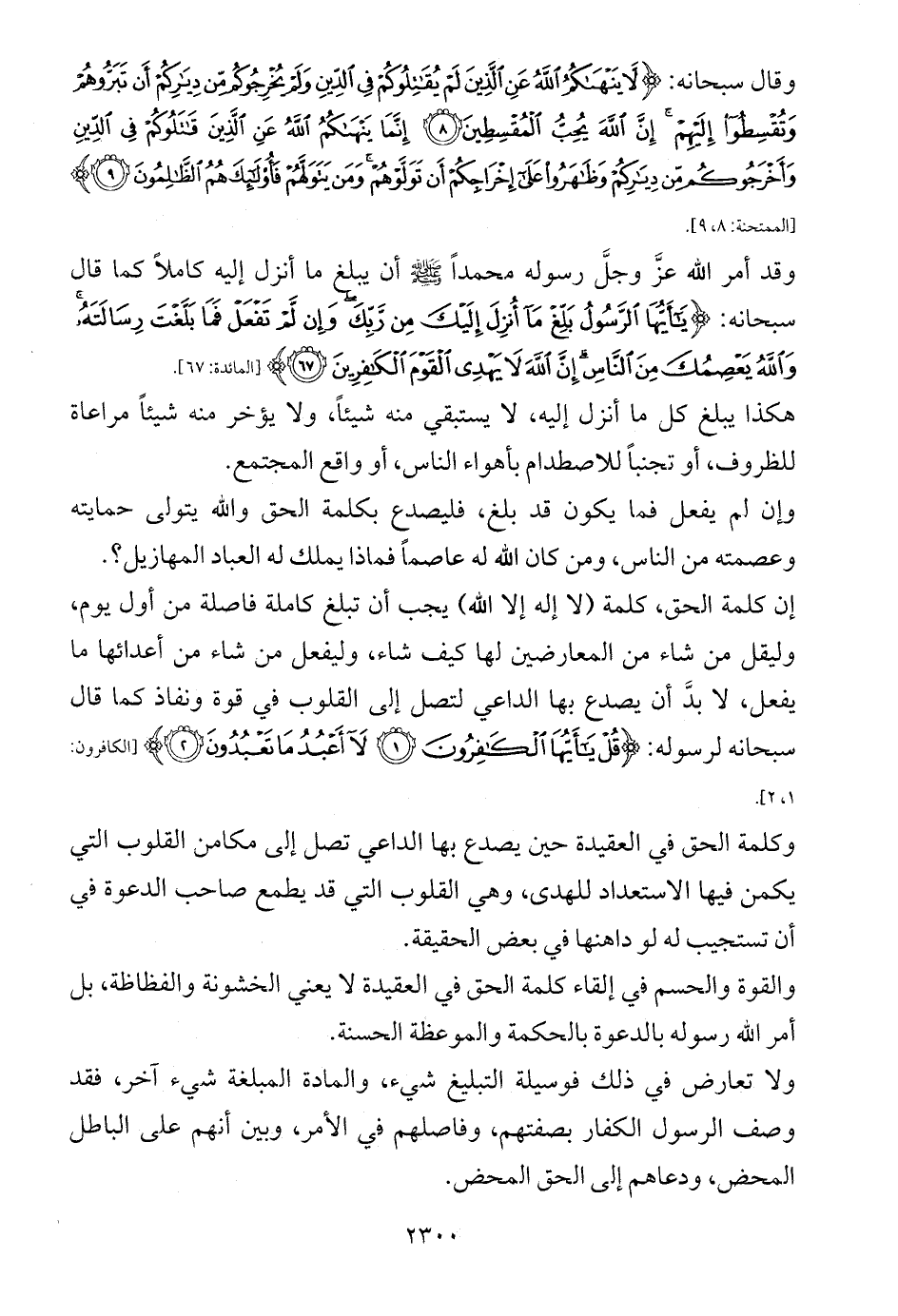 إن كلمة الحق، كلمة (لا إله إلا الله) يجب أن تبلغ كاملة فاصلة من أول يوم، وليقل من شاء من المعارضين لها كيف شاء، وليفعل من شاء من أعدائها ما يفعل، لا بدَّ أن يصدع بها الداعي لتصل إلى القلوب في قوة ونفاذ كما قال سبحانه لرسوله: {قُلْ يَاأَيُّهَا الْكَافِرُونَ (1) لَا أَعْبُدُ مَا تَعْبُدُونَ (2)} [الكافرون: 1، 2].