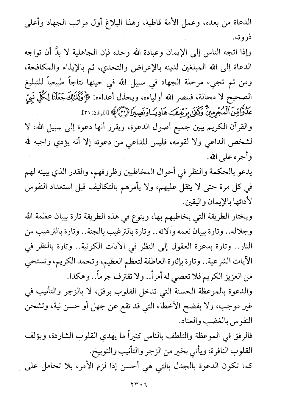 ويختار الطريقة التي يخاطبهم بها، وينوع في هذه الطريقة تارة ببيان عظمة الله وجلاله .. وتارة ببيان نعمه وآلائه .. وتارة بالترغيب بالجنة .. وتارة بالترهيب من النار .. وتارة بدعوة العقول إلى النظر في الآيات الكونية .. وتارة بالنظر في الآيات الشرعية .. وتارة بإثارة العاطفة لتعظم العظيم، وتحمد الكريم، وتستحي من العزيز الكريم فلا تعصي له أمراً .. ولا تقترف جرماً .. وهكذا.
