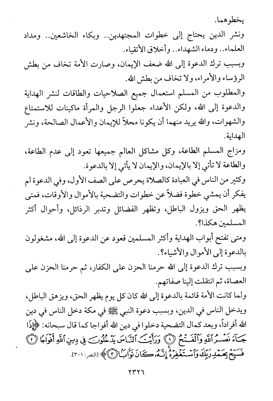 ونشر الدين يحتاج إلى خطوات المجتهدين .. وبكاء الخاشعين .. ومداد العلماء .. ودماء الشهداء .. وأخلاق الأتقياء.