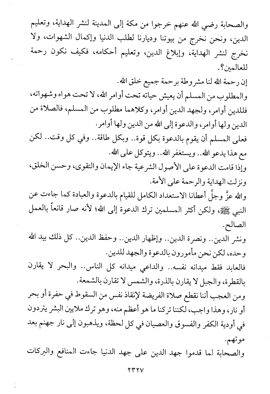 ومن العجب أننا نقطع صلاة الفريضة لإنقاذ نفس من السقوط في حفرة أو بحر أو نار، وهذا واجب، لكننا تركنا ما هو أعظم منه، وهو ترك ملايين البشر يتردون في أودية الكفر والفسوق والعصيان في كل لحظة، ويذهبون إلى نار جهنم بعد موتهم.