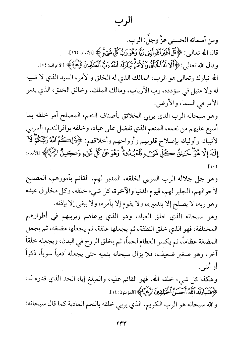 وهو جل جلاله الرب المربي لخلقه، المدبر لهم، القائم بأمورهم، المصلح لأحوالهم، الجابر لهم، قيوم الدنيا والآخرة، كل شيء خلقه، وكل مخلوق عبده وهو ربه، لا يصلح إلا بتدبيره، ولا يقوم إلا بأمره، ولا يبقى إلا بإذنه.