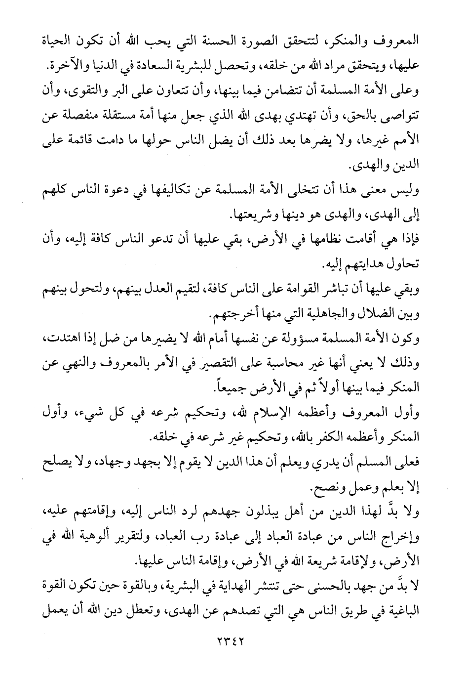 وليس معنى هذا أن تتخلى الأمة المسلمة عن تكاليفها في دعوة الناس كلهم إلى الهدى، والهدى هو دينها وشريعتها.
