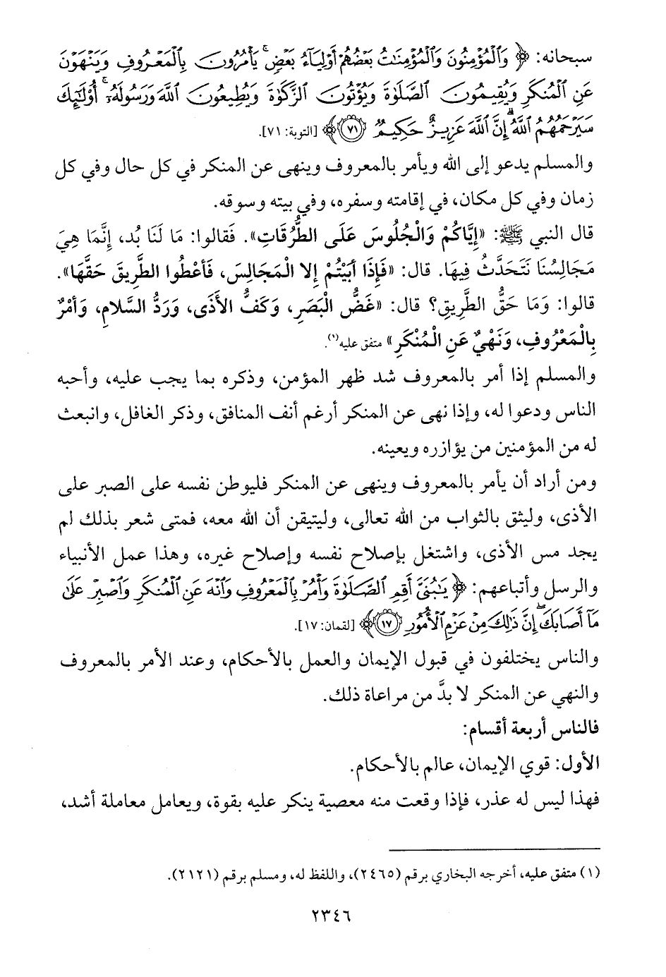 قال النبي - صلى الله عليه وسلم -: «إِيَّاكُمْ وَالْجُلُوسَ عَلَى الطُّرُقَاتِ». فَقالوا: مَا لَنَا بُدٌّ، إِنَّمَا هِيَ مَجَالِسُنَا نَتَحَدَّثُ فِيهَا. قال: «فَإِذَا أبَيْتُمْ إِلا الْمَجَالِسَ، فَأعْطُوا الطَّرِيقَ حَقَّهَا». قالوا: وَمَا حَقُّ الطَّرِيقِ؟ قال: «غَضُّ الْبَصَرِ، وَكَفُّ الأَذَى، وَرَدُّ السَّلامِ، وَأمْرٌ بِالْمَعْرُوفِ، وَنَهْيٌ عَنِ الْمُنْكَرِ» متفق عليه (¬1).