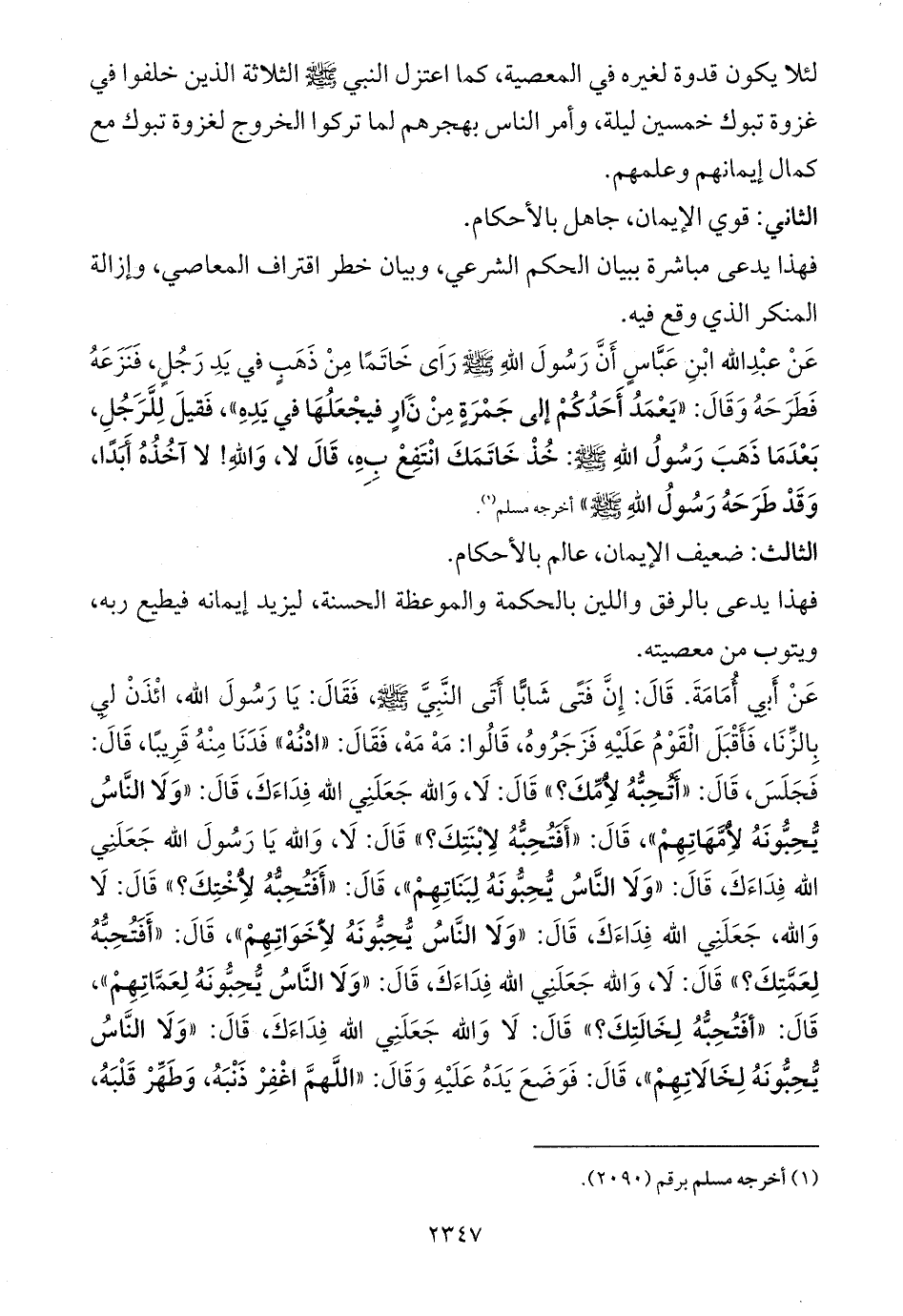 عَنْ أَبِي أُمَامَةَ. قَالَ: إِنَّ فَتًى شَابًّا أَتَى النَّبِيَّ - صلى الله عليه وسلم -، فَقَالَ: يَا رَسُولَ الله، ائْذَنْ لِي بِالزِّنَا، فَأَقْبَلَ الْقَوْمُ عَلَيْهِ فَزَجَرُوهُ، قَالُوا: مَهْ مَهْ، فَقَالَ: «ادْنُهْ» فَدَنَا مِنْهُ قَرِيبًا، قَالَ: فَجَلَسَ، قَالَ: «أَتُحِبُّهُ لأُِمِّكَ؟» قَالَ: لَا، وَالله جَعَلَنِي الله فِدَاءَكَ، قَالَ: «وَلَا النَّاسُ يُّحِبُّونَهُ لأُِمَّهَاتِهِمْ»، قَالَ: «أَفَتُحِبُّهُ لاِبْنَتِكَ؟» قَالَ: لَا، وَالله يَا رَسُولَ الله جَعَلَنِي الله فِدَاءَكَ، قَالَ: «وَلَا النَّاسُ يُّحِبُّونَهُ لِبَنَاتِهِمْ»، قَالَ: «أَفَتُحِبُّهُ لأُِخْتِكَ؟» قَالَ: لَا وَالله، جَعَلَنِي الله فِدَاءَكَ، قَالَ: «وَلَا النَّاسُ يُّحِبُّونَهُ لأَِخَوَاتِهِمْ»، قَالَ: «أَفَتُحِبُّهُ لِعَمَّتِكَ؟» قَالَ: لَا، وَالله جَعَلَنِي الله فِدَاءَكَ، قَالَ: «وَلَا النَّاسُ يُّحِبُّونَهُ لِعَمَّاتِهِمْ»، قَالَ: «أفَتُحِبُّهُ لِخَالَتِكَ؟» قَالَ: لَا وَالله جَعَلَنِي الله فِدَاءَكَ، قَالَ: «وَلَا النَّاسُ يُّحِبُّونَهُ لِخَالَاتِهِمْ»، قَالَ: فَوَضَعَ يَدَهُ عَلَيْهِ وَقَالَ: «اللَّهمَّ اغْفِرْ ذَنْبَهُ، وَطَهِّرْ قَلْبَهُ،