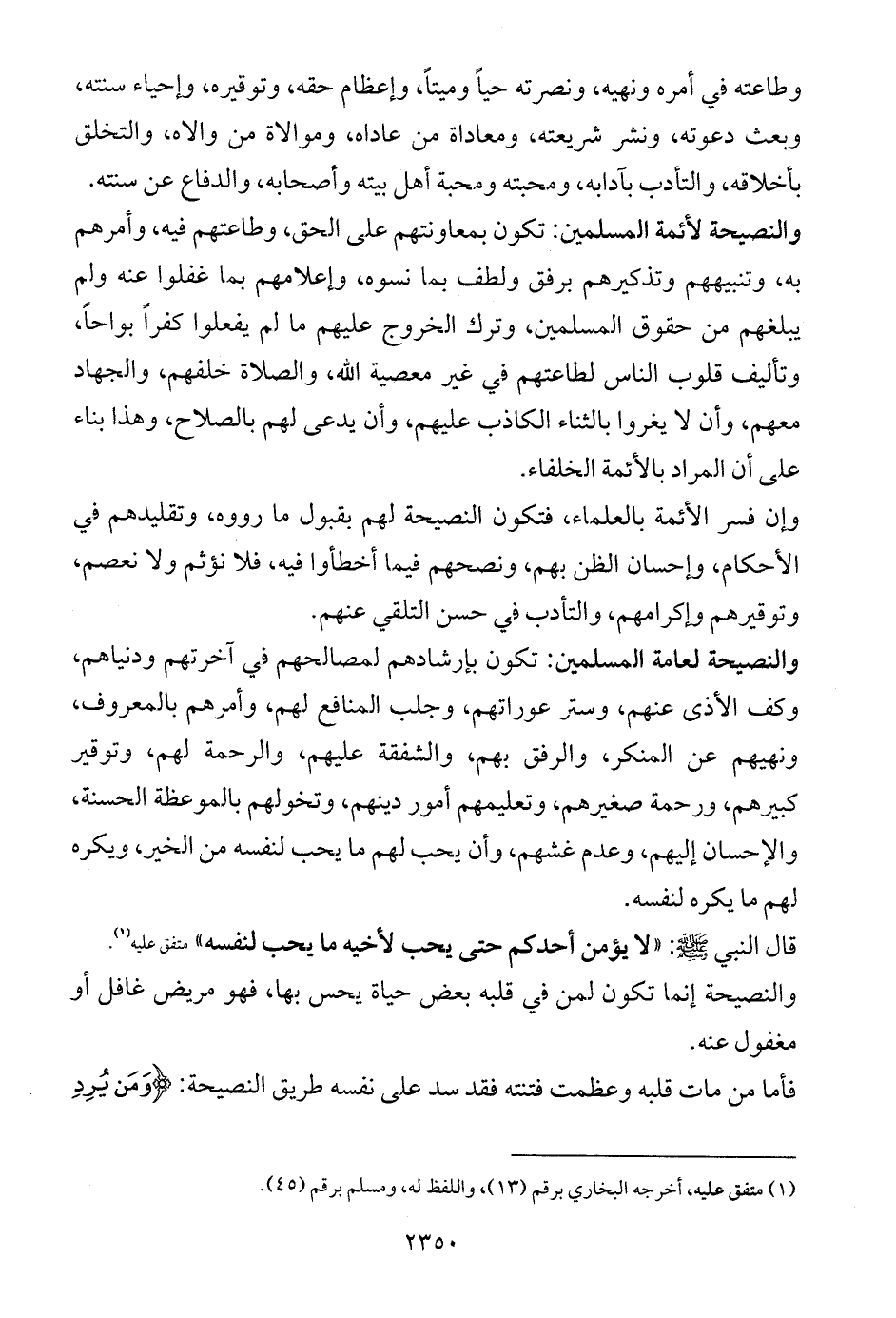 وطاعته في أمره ونهيه، ونصرته حياً وميتاً، وإعظام حقه، وتوقيره، وإحياء سنته، وبعث دعوته، ونشر شريعته، ومعاداة من عاداه، وموالاة من والاه، والتخلق بأخلاقه، والتأدب بآدابه، ومحبته ومحبة أهل بيته وأصحابه، والدفاع عن سنته.