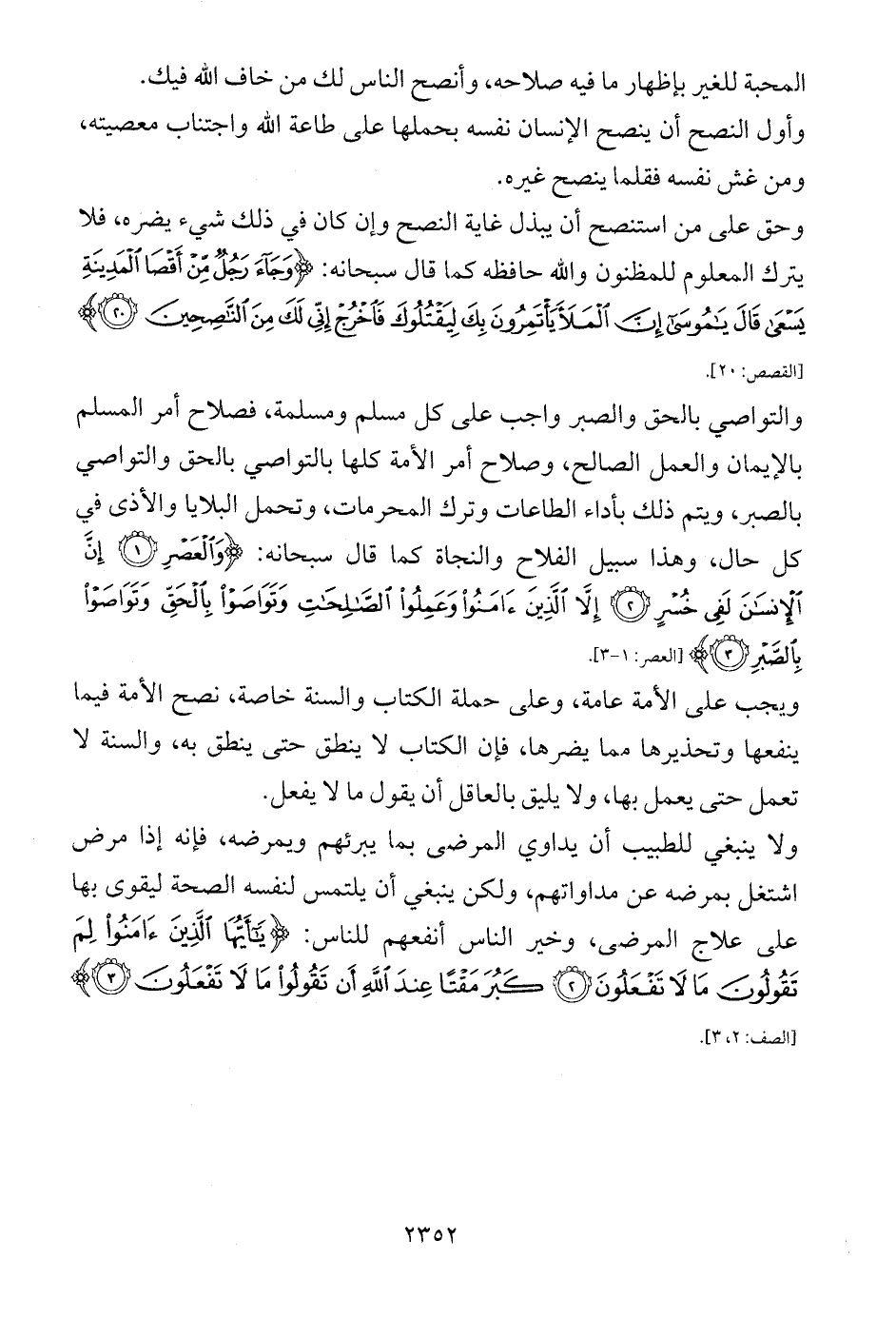 ويجب على الأمة عامة، وعلى حملة الكتاب والسنة خاصة، نصح الأمة فيما ينفعها وتحذيرها مما يضرها، فإن الكتاب لا ينطق حتى ينطق به، والسنة لا تعمل حتى يعمل بها، ولا يليق بالعاقل أن يقول ما لا يفعل.