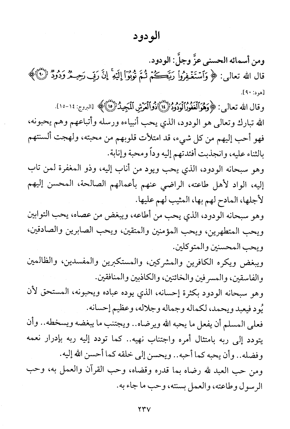 وهو سبحانه الودود، الذي يحب من أطاعه، ويبغض من عصاه، يحب التوابين ويحب المتطهرين، ويحب المؤمنين والمتقين، ويحب الصابرين والصادقين، ويحب المحسنين والمتوكلين.