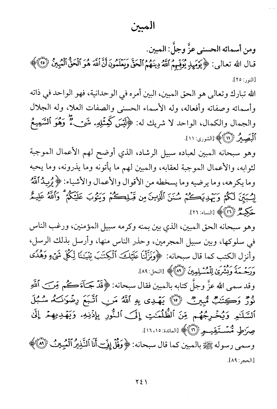 وقد سمى الله عزَّ وجلَّ كتابه بالمبين فقال سبحانه: {قَدْ جَاءَكُمْ مِنَ اللَّهِ نُورٌ وَكِتَابٌ مُبِينٌ (15) يَهْدِي بِهِ اللَّهُ مَنِ اتَّبَعَ رِضْوَانَهُ سُبُلَ السَّلَامِ وَيُخْرِجُهُمْ مِنَ الظُّلُمَاتِ إِلَى النُّورِ بِإِذْنِهِ وَيَهْدِيهِمْ إِلَى صِرَاطٍ مُسْتَقِيمٍ (16)} [المائدة: 15، 16].