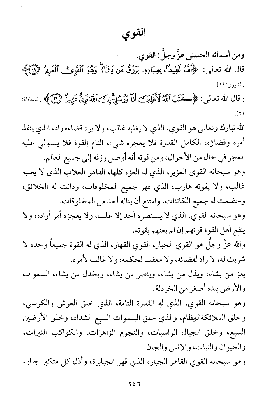 وهو سبحانه القوي، الذي له القدرة التامة، الذي خلق العرش والكرسي، وخلق الملائكةالعِظام، والذي خلق السموات السبع الشداد، وخلق الأرضين السبع، وخلق الجبال الراسيات، والنجوم الزاهرات، والكواكب النيرات، والحيوان والنبات، والإنس والجان.