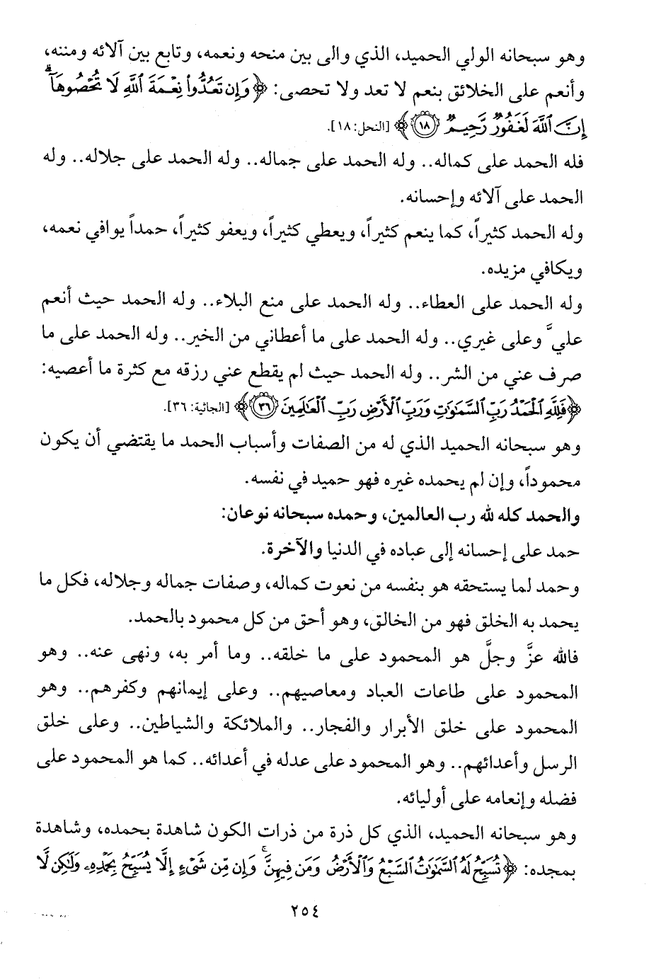 فالله عزَّ وجلَّ هو المحمود على ما خلقه .. وما أمر به، ونهى عنه .. وهو المحمود على طاعات العباد ومعاصيهم .. وعلى إيمانهم وكفرهم .. وهو المحمود على خلق الأبرار والفجار .. والملائكة والشياطين .. وعلى خلق الرسل وأعدائهم .. وهو المحمود على عدله في أعدائه .. كما هو المحمود على فضله وإنعامه على أوليائه.