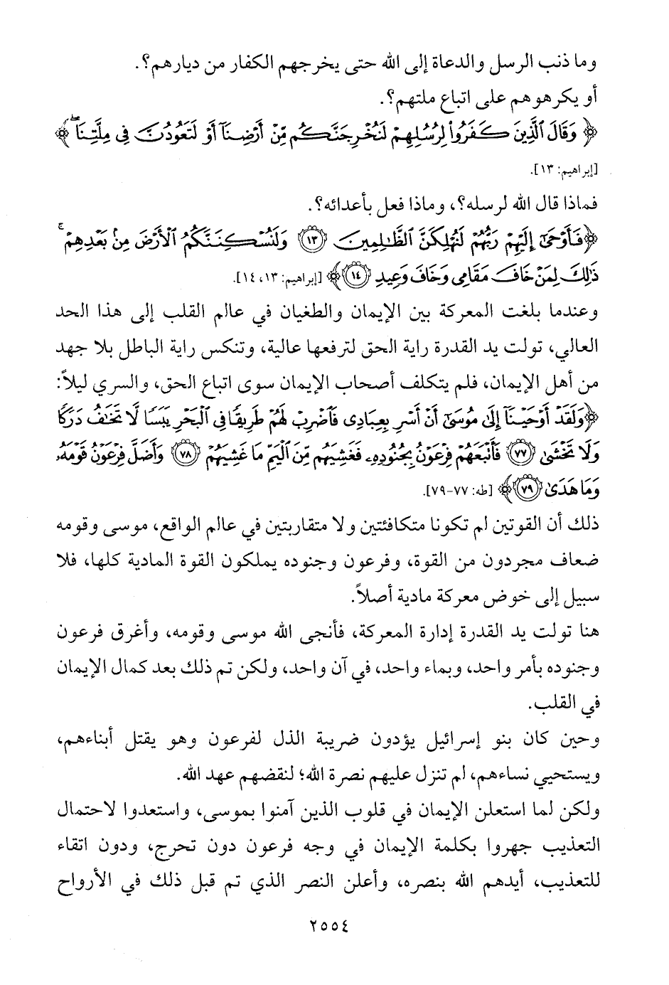 وعندما بلغت المعركة بين الإيمان والطغيان في عالم القلب إلى هذا الحد العالي، تولت يد القدرة راية الحق لترفعها عالية، وتنكس راية الباطل بلا جهد من أهل الإيمان، فلم يتكلف أصحاب الإيمان سوى اتباع الحق، والسري ليلاً: {وَلَقَدْ أَوْحَيْنَا إِلَى مُوسَى أَنْ أَسْرِ بِعِبَادِي فَاضْرِبْ لَهُمْ طَرِيقًا فِي الْبَحْرِ يَبَسًا لَا تَخَافُ دَرَكًا وَلَا تَخْشَى (77) فَأَتْبَعَهُمْ فِرْعَوْنُ بِجُنُودِهِ فَغَشِيَهُمْ مِنَ الْيَمِّ مَا غَشِيَهُمْ (78) وَأَضَلَّ فِرْعَوْنُ قَوْمَهُ وَمَا هَدَى (79)} [طه: 77 - 79].