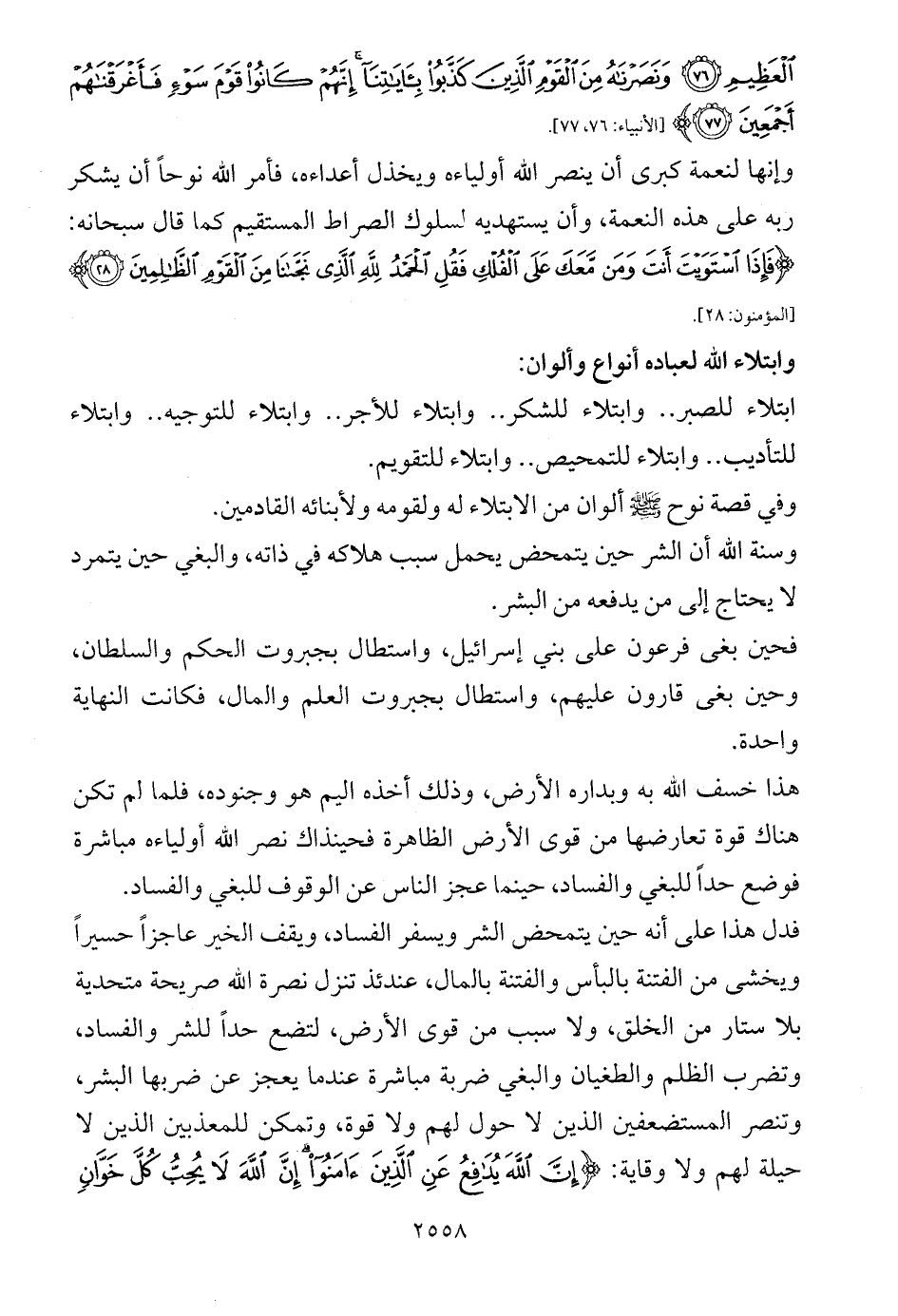 وإنها لنعمة كبرى أن ينصر الله أولياءه ويخذل أعداءه، فأمر الله نوحاً أن يشكر ربه على هذه النعمة، وأن يستهديه لسلوك الصراط المستقيم كما قال سبحانه: {فَإِذَا اسْتَوَيْتَ أَنْتَ وَمَنْ مَعَكَ عَلَى الْفُلْكِ فَقُلِ الْحَمْدُ لِلَّهِ الَّذِي نَجَّانَا مِنَ الْقَوْمِ الظَّالِمِينَ (28)} [المؤمنون: 28].