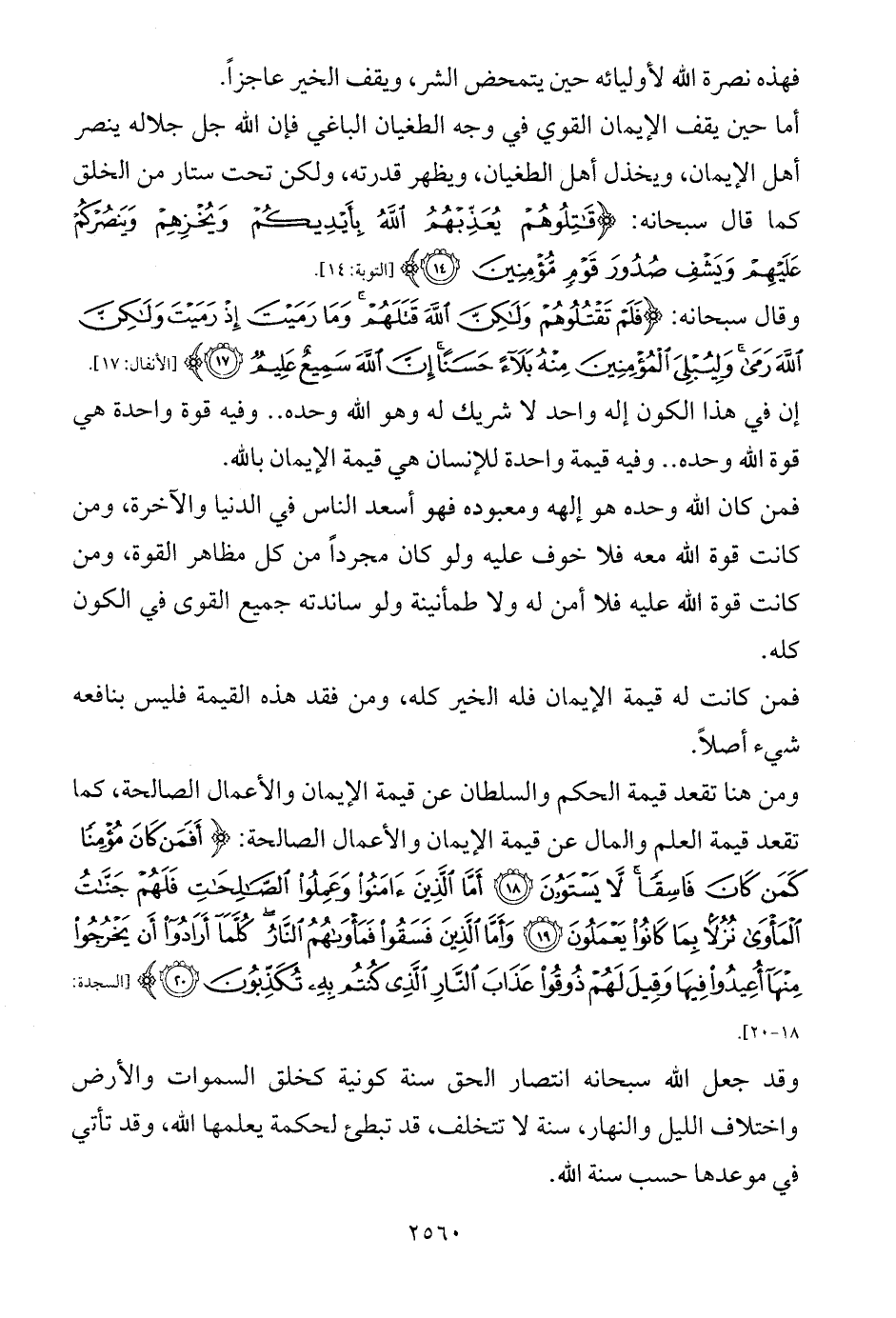 ومن هنا تقعد قيمة الحكم والسلطان عن قيمة الإيمان والأعمال الصالحة، كما تقعد قيمة العلم والمال عن قيمة الإيمان والأعمال الصالحة: {أَفَمَنْ كَانَ مُؤْمِنًا كَمَنْ كَانَ فَاسِقًا لَا يَسْتَوُونَ (18) أَمَّا الَّذِينَ آمَنُوا وَعَمِلُوا الصَّالِحَاتِ فَلَهُمْ جَنَّاتُ الْمَأْوَى نُزُلًا بِمَا كَانُوا يَعْمَلُونَ (19) وَأَمَّا الَّذِينَ فَسَقُوا فَمَأْوَاهُمُ النَّارُ كُلَّمَا أَرَادُوا أَنْ يَخْرُجُوا مِنْهَا أُعِيدُوا فِيهَا وَقِيلَ لَهُمْ ذُوقُوا عَذَابَ النَّارِ الَّذِي كُنْتُمْ بِهِ تُكَذِّبُونَ (20)} [السجدة: 18 - 20].