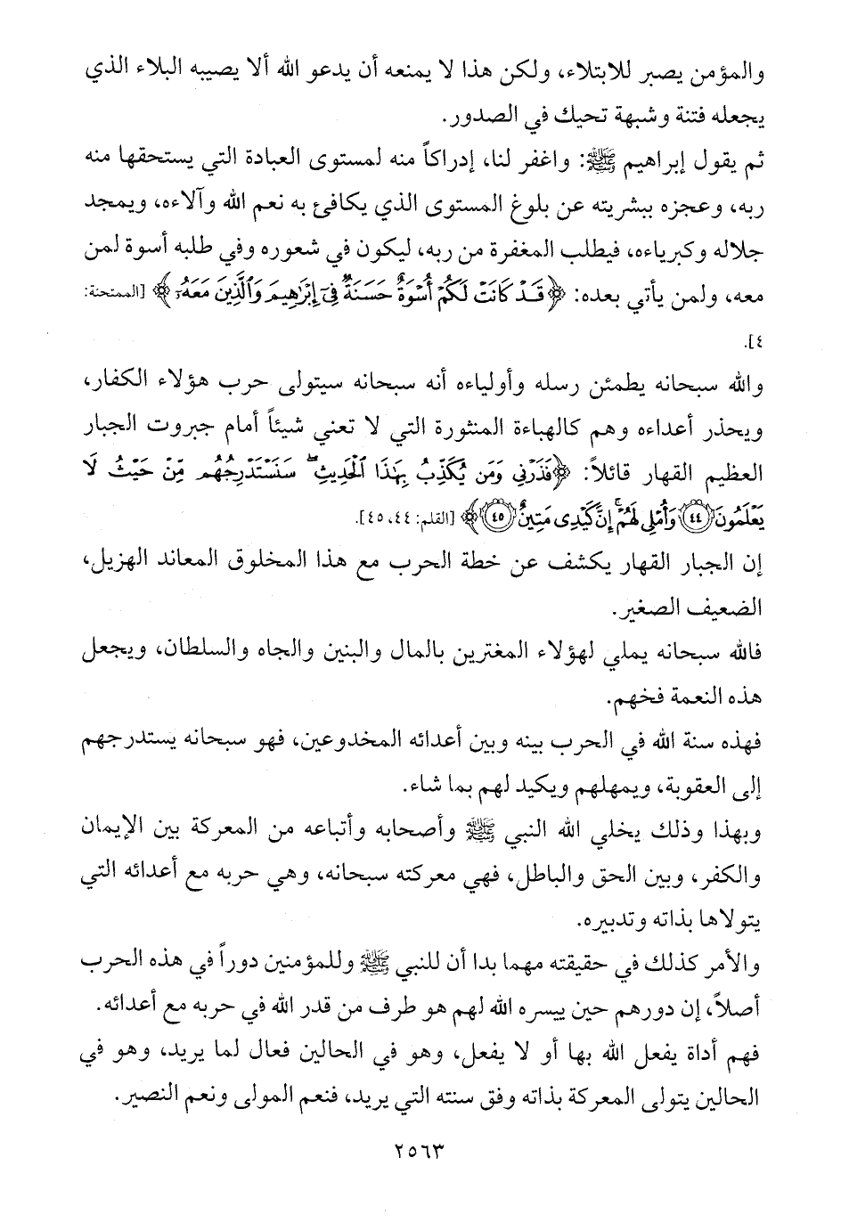 وبهذا وذلك يخلي الله النبي - صلى الله عليه وسلم - وأصحابه وأتباعه من المعركة بين الإيمان والكفر، وبين الحق والباطل، فهي معركته سبحانه، وهي حربه مع أعدائه التي يتولاها بذاته وتدبيره.