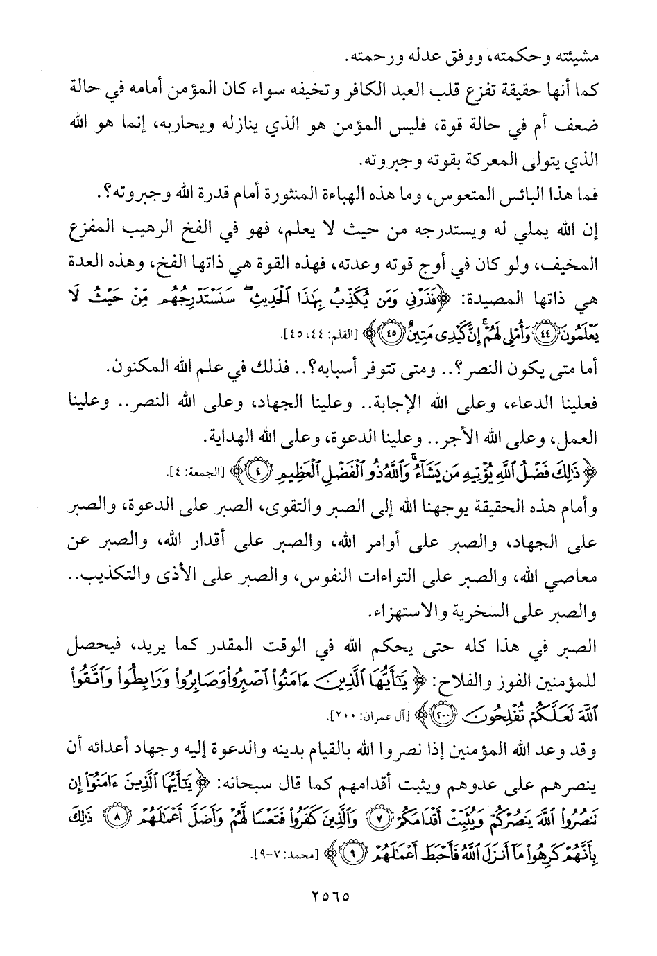 وأمام هذه الحقيقة يوجهنا الله إلى الصبر والتقوى، الصبر على الدعوة، والصبر على الجهاد، والصبر على أوامر الله، والصبر على أقدار الله، والصبر عن معاصي الله، والصبر على التواءات النفوس، والصبر على الأذى والتكذيب .. والصبر على السخرية والاستهزاء.