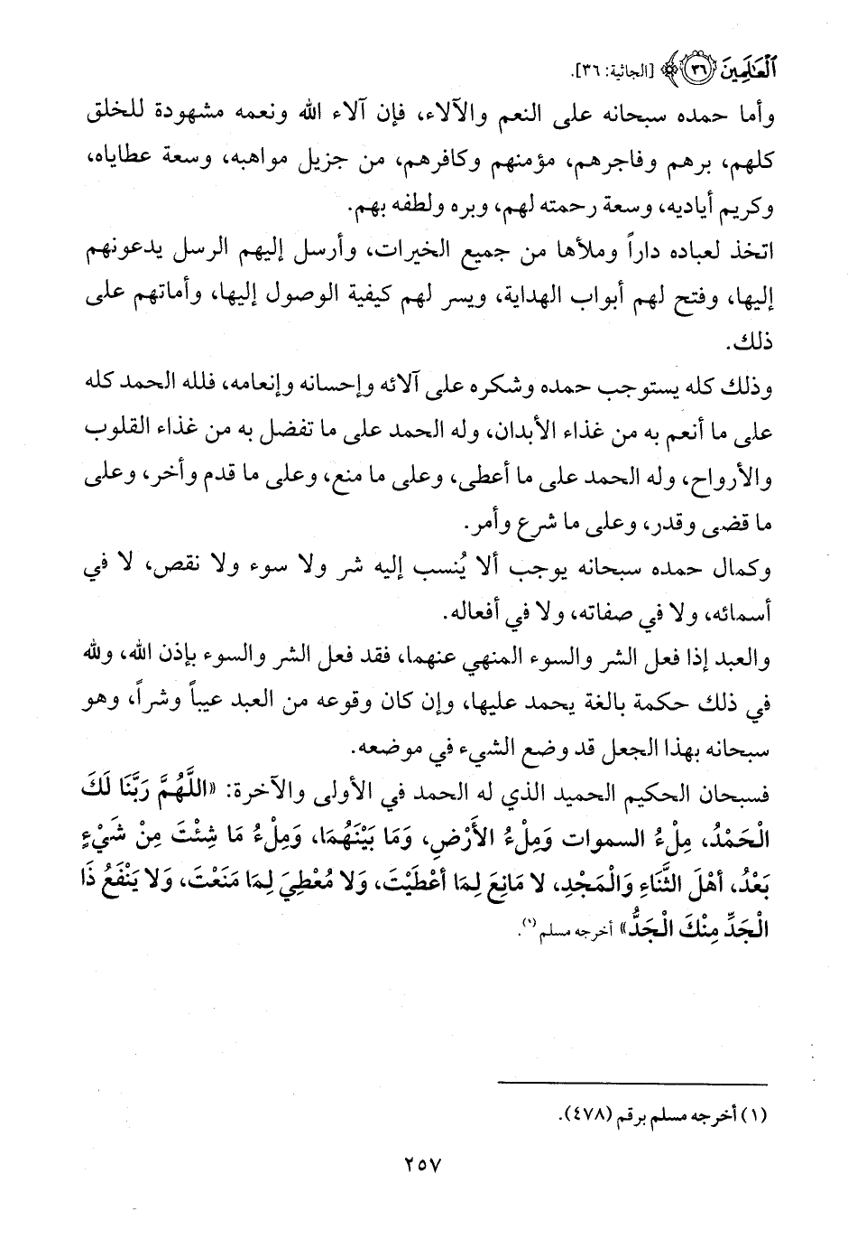 فسبحان الحكيم الحميد الذي له الحمد في الأولى والآخرة: «اللَّهُمَّ رَبَّنَا لَكَ الْحَمْدُ، مِلْءُ السموات وَمِلْءُ الأَرْضِ، وَمَا بَيْنَهُمَا، وَمِلْءُ مَا شِئْتَ مِنْ شَيْءٍ بَعْدُ، أهْلَ الثَّنَاءِ وَالْمَجْدِ، لا مَانِعَ لِمَا أعْطَيْتَ، وَلا مُعْطِيَ لِمَا مَنَعْتَ، وَلا يَنْفَعُ ذَا الْجَدِّ مِنْكَ الْجَدُّ» أخرجه مسلم (¬1).