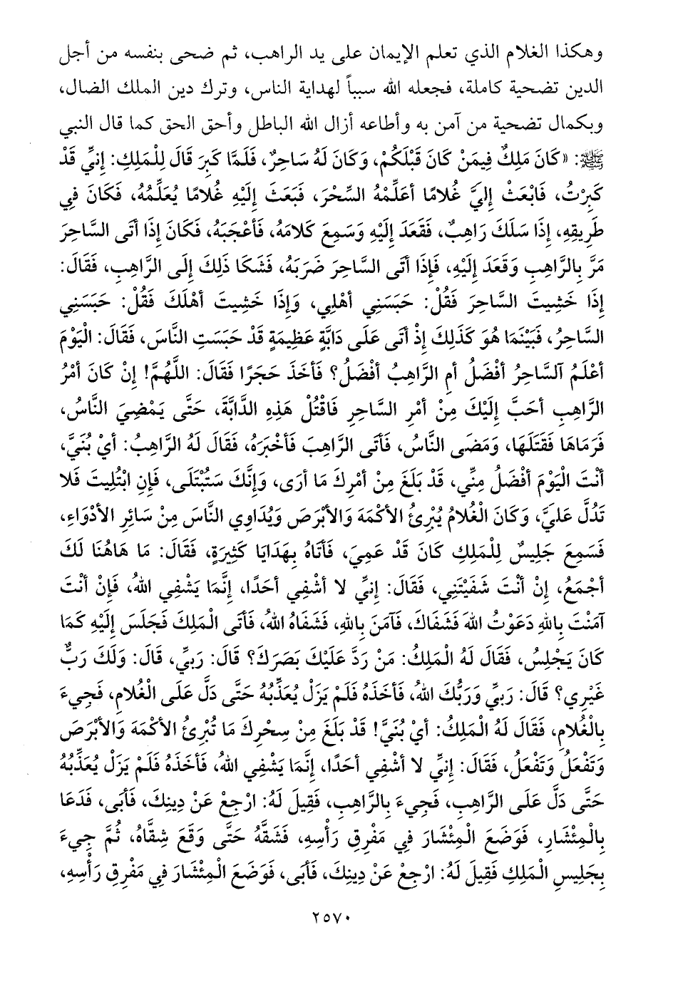 وهكذا الغلام الذي تعلم الإيمان على يد الراهب، ثم ضحى بنفسه من أجل الدين تضحية كاملة، فجعله الله سبباً لهداية الناس، وترك دين الملك الضال، وبكمال تضحية من آمن به وأطاعه أزال الله الباطل وأحق الحق كما قال النبي - صلى الله عليه وسلم -: «كَانَ مَلِكٌ فِيمَنْ كَانَ قَبْلَكُمْ، وَكَانَ لَهُ سَاحِرٌ، فَلَمَّا كَبِرَ قَالَ لِلْمَلِكِ: إِنِّي قَدْ كَبِرْتُ، فَابْعَثْ إِلَيَّ غُلامًا أعَلِّمْهُ السِّحْرَ، فَبَعَثَ إِلَيْهِ غُلامًا يُعَلِّمُهُ، فَكَانَ فِي طَرِيقِهِ، إِذَا سَلَكَ رَاهِبٌ، فَقَعَدَ إِلَيْهِ وَسَمِعَ كَلامَهُ، فَأعْجَبَهُ، فَكَانَ إِذَا أتَى السَّاحِرَ مَرَّ بِالرَّاهِبِ وَقَعَدَ إِلَيْهِ، فَإِذَا أتَى السَّاحِرَ ضَرَبَهُ، فَشَكَا ذَلِكَ إِلَى الرَّاهِبِ، فَقَالَ: إِذَا خَشِيتَ السَّاحِرَ فَقُلْ: حَبَسَنِي أهْلِي، وَإِذَا خَشِيتَ أهْلَكَ فَقُلْ: حَبَسَنِي السَّاحِرُ، فَبَيْنَمَا هُوَ كَذَلِكَ إِذْ أتَى عَلَى دَابَّةٍ عَظِيمَةٍ قَدْ حَبَسَتِ النَّاسَ، فَقَالَ: الْيَوْمَ أعْلَمُ آلسَّاحِرُ أفْضَلُ أمِ الرَّاهِبُ أفْضَلُ؟ فَأخَذَ حَجَرًا فَقَالَ: اللَّهُمَّ! إِنْ كَانَ أمْرُ الرَّاهِبِ أحَبَّ إِلَيْكَ مِنْ أمْرِ السَّاحِرِ فَاقْتُلْ هَذِهِ الدَّابَّةَ، حَتَّى يَمْضِيَ النَّاسُ، فَرَمَاهَا فَقَتَلَهَا، وَمَضَى النَّاسُ، فَأتَى الرَّاهِبَ فَأخْبَرَهُ، فَقَالَ لَهُ الرَّاهِبُ: أيْ بُنَيَّ، أنْتَ الْيَوْمَ أفْضَلُ مِنِّي، قَدْ بَلَغَ مِنْ أمْرِكَ مَا أرَى، وَإِنَّكَ سَتُبْتَلَى، فَإِنِ ابْتُلِيتَ فَلا تَدُلَّ عَلَيَّ، وَكَانَ الْغُلامُ يُبْرِئُ الأكْمَهَ وَالأبْرَصَ وَيُدَاوِي النَّاسَ مِنْ سَائِرِ الأدْوَاءِ، فَسَمِعَ جَلِيسٌ لِلْمَلِكِ كَانَ قَدْ عَمِيَ، فَأتَاهُ بِهَدَايَا كَثِيرَةٍ، فَقَالَ: مَا هَاهُنَا لَكَ أجْمَعُ، إِنْ أنْتَ شَفَيْتَنِي، فَقَالَ: إِنِّي لا أشْفِي أحَدًا، إِنَّمَا يَشْفِي اللهُ، فَإِنْ أنْتَ آمَنْتَ بِاللهِ دَعَوْتُ اللهَ فَشَفَاكَ، فَآمَنَ بِاللهِ، فَشَفَاهُ اللهُ، فَأتَى الْمَلِكَ فَجَلَسَ إِلَيْهِ كَمَا كَانَ يَجْلِسُ، فَقَالَ لَهُ الْمَلِكُ: مَنْ رَدَّ عَلَيْكَ بَصَرَكَ؟ قَالَ: رَبِّي، قَالَ: وَلَكَ رَبٌّ غَيْرِي؟ قَالَ: رَبِّي وَرَبُّكَ اللهُ، فَأخَذَهُ فَلَمْ يَزَلْ يُعَذِّبُهُ حَتَّى دَلَّ عَلَى الْغُلامِ، فَجِيءَ بِالْغُلامِ، فَقَالَ لَهُ الْمَلِكُ: أيْ بُنَيَّ! قَدْ بَلَغَ مِنْ سِحْرِكَ مَا تُبْرِئُ الأكْمَهَ وَالأبْرَصَ وَتَفْعَلُ وَتَفْعَلُ، فَقَالَ: إِنِّي لا أشْفِي أحَدًا، إِنَّمَا يَشْفِي اللهُ، فَأخَذَهُ فَلَمْ يَزَلْ يُعَذِّبُهُ حَتَّى دَلَّ عَلَى الرَّاهِبِ، فَجِيءَ بِالرَّاهِبِ، فَقِيلَ لَهُ: ارْجِعْ عَنْ دِينِكَ، فَأبَى، فَدَعَا بِالْمِئْشَارِ، فَوَضَعَ الْمِئْشَارَ فِي مَفْرِقِ رَأْسِهِ،