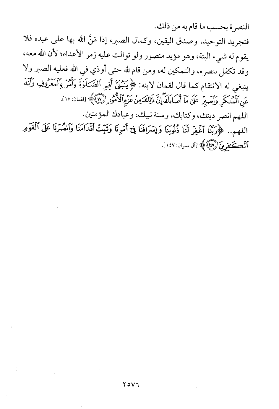 فتجريد التوحيد، وصدق اليقين، وكمال الصبر، إذا مَنَّ الله بها على عبده فلا يقوم له شيء البتة، وهو مؤيد منصور ولو توالت عليه زمر الأعداء؛ لأن الله معه، وقد تكفل بنصره، والتمكين له، ومن قام لله حتى أوذي في الله فعليه الصبر ولا ينبغي له الانتقام كما قال لقمان لابنه: {يَابُنَيَّ أَقِمِ الصَّلَاةَ وَأْمُرْ بِالْمَعْرُوفِ وَانْهَ عَنِ الْمُنْكَرِ وَاصْبِرْ عَلَى مَا أَصَابَكَ إِنَّ ذَلِكَ مِنْ عَزْمِ الْأُمُورِ (17)} [لقمان: 17].