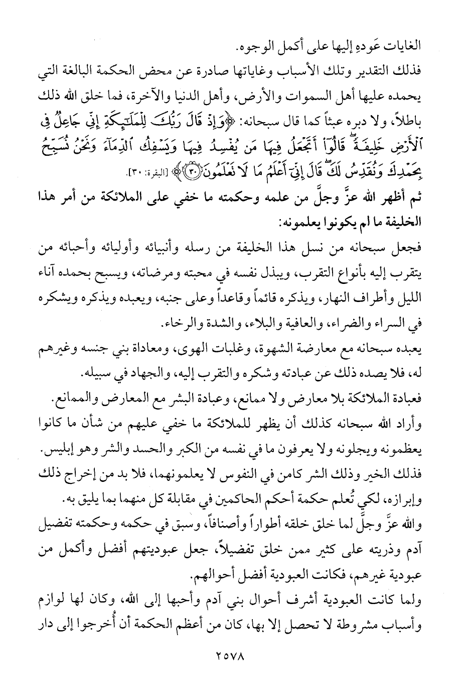 فذلك التقدير وتلك الأسباب وغاياتها صادرة عن محض الحكمة البالغة التي يحمده عليها أهل السموات والأرض، وأهل الدنيا والآخرة، فما خلق الله ذلك باطلاً، ولا دبره عبثاً كما قال سبحانه: {وَإِذْ قَالَ رَبُّكَ لِلْمَلَائِكَةِ إِنِّي جَاعِلٌ فِي الْأَرْضِ خَلِيفَةً قَالُوا أَتَجْعَلُ فِيهَا مَنْ يُفْسِدُ فِيهَا وَيَسْفِكُ الدِّمَاءَ وَنَحْنُ نُسَبِّحُ بِحَمْدِكَ وَنُقَدِّسُ لَكَ قَالَ إِنِّي أَعْلَمُ مَا لَا تَعْلَمُونَ (30)} [البقرة: 30].