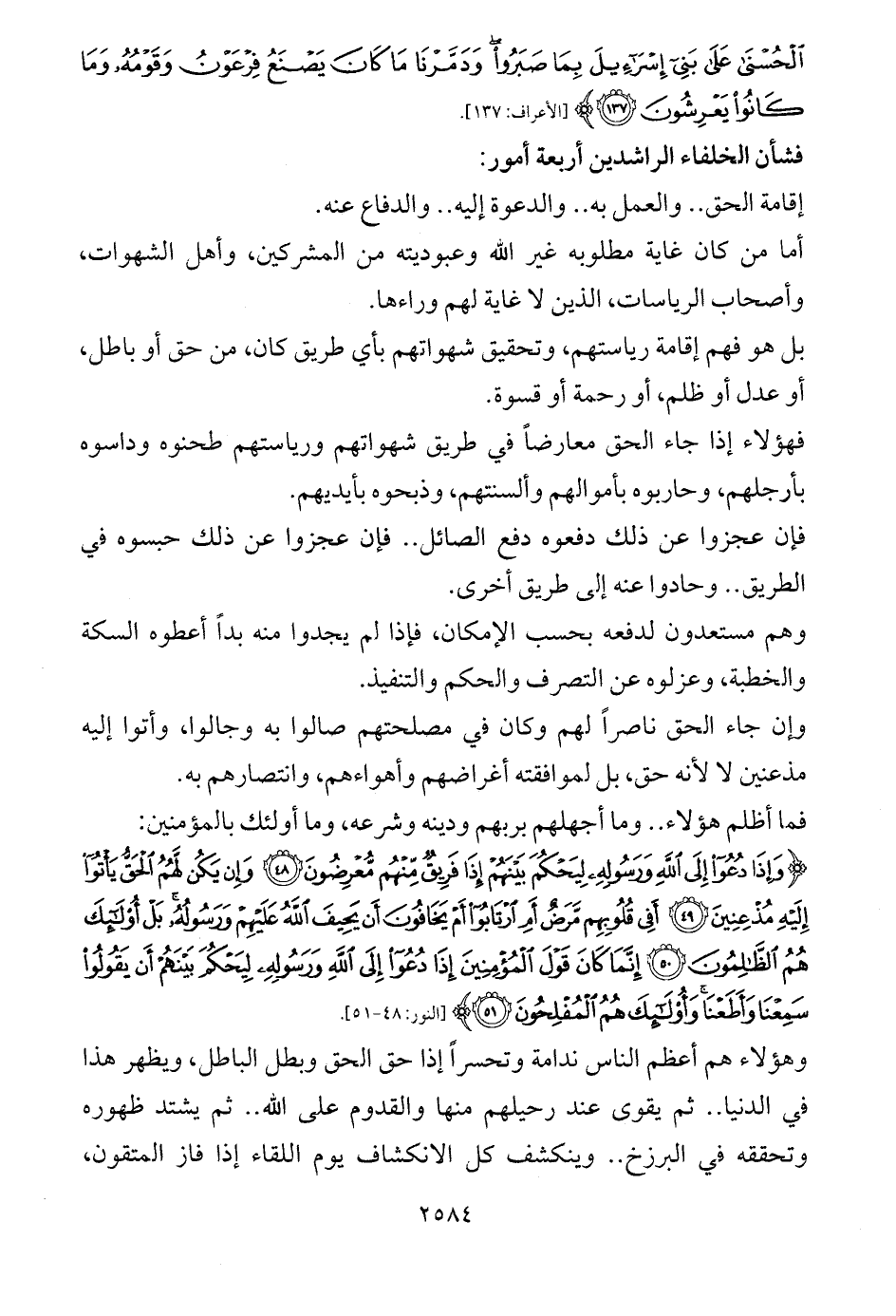 {وَإِذَا دُعُوا إِلَى اللَّهِ وَرَسُولِهِ لِيَحْكُمَ بَيْنَهُمْ إِذَا فَرِيقٌ مِنْهُمْ مُعْرِضُونَ (48) وَإِنْ يَكُنْ لَهُمُ الْحَقُّ يَأْتُوا إِلَيْهِ مُذْعِنِينَ (49) أَفِي قُلُوبِهِمْ مَرَضٌ أَمِ ارْتَابُوا أَمْ يَخَافُونَ أَنْ يَحِيفَ اللَّهُ عَلَيْهِمْ وَرَسُولُهُ بَلْ أُولَئِكَ هُمُ الظَّالِمُونَ (50) إِنَّمَا كَانَ قَوْلَ الْمُؤْمِنِينَ إِذَا دُعُوا إِلَى اللَّهِ وَرَسُولِهِ لِيَحْكُمَ بَيْنَهُمْ أَنْ يَقُولُوا سَمِعْنَا وَأَطَعْنَا وَأُولَئِكَ هُمُ الْمُفْلِحُونَ (51)} [النور: 48 - 51].