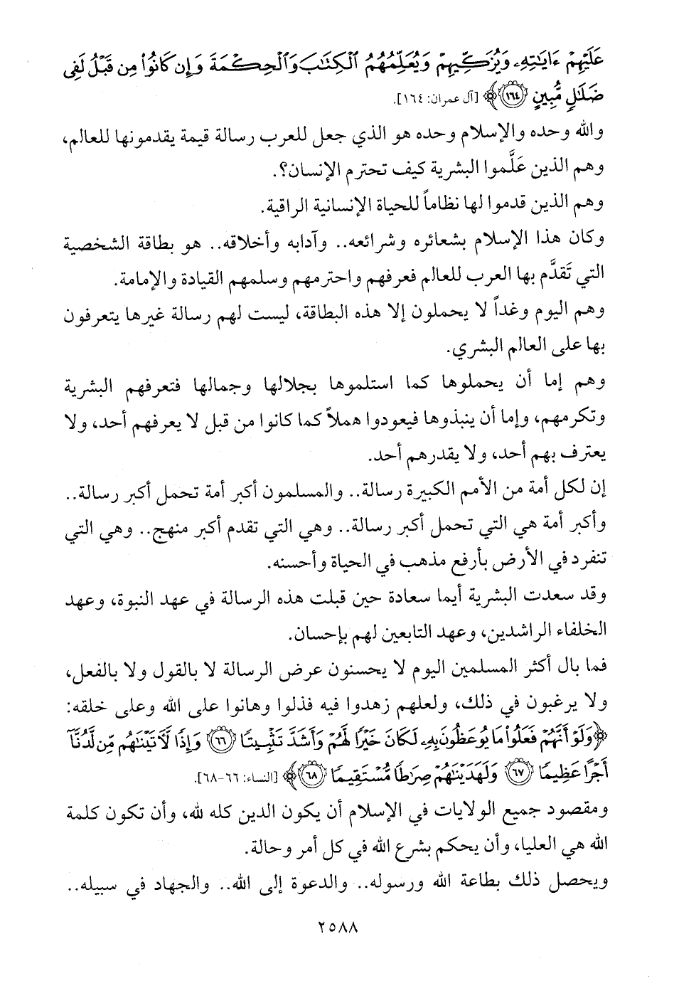 إن لكل أمة من الأمم الكبيرة رسالة .. والمسلمون أكبر أمة تحمل أكبر رسالة .. وأكبر أمة هي التي تحمل أكبر رسالة .. وهي التي تقدم أكبر منهج .. وهي التي تنفرد في الأرض بأرفع مذهب في الحياة وأحسنه.