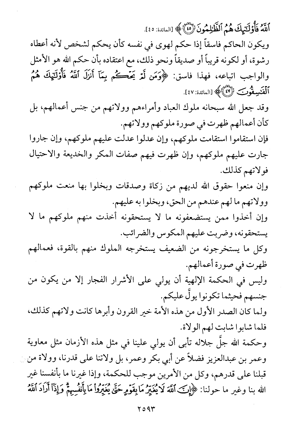 وحكمة الله جلَّ جلاله تأبى أن يولي علينا في مثل هذه الأزمان مثل معاوية وعمر بن عبد العزيز فضلاً عن أبي بكر وعمر، بل ولاتنا على قدرنا، وولاة من قبلنا على قدرهم، وكل من الأمرين موجب للحكمة، وإذا غيرنا ما بأنفسنا غير الله بنا وغير ما حولنا: {إِنَّ اللَّهَ لَا يُغَيِّرُ مَا بِقَوْمٍ حَتَّى يُغَيِّرُوا مَا بِأَنْفُسِهِمْ وَإِذَا أَرَادَ اللَّهُ