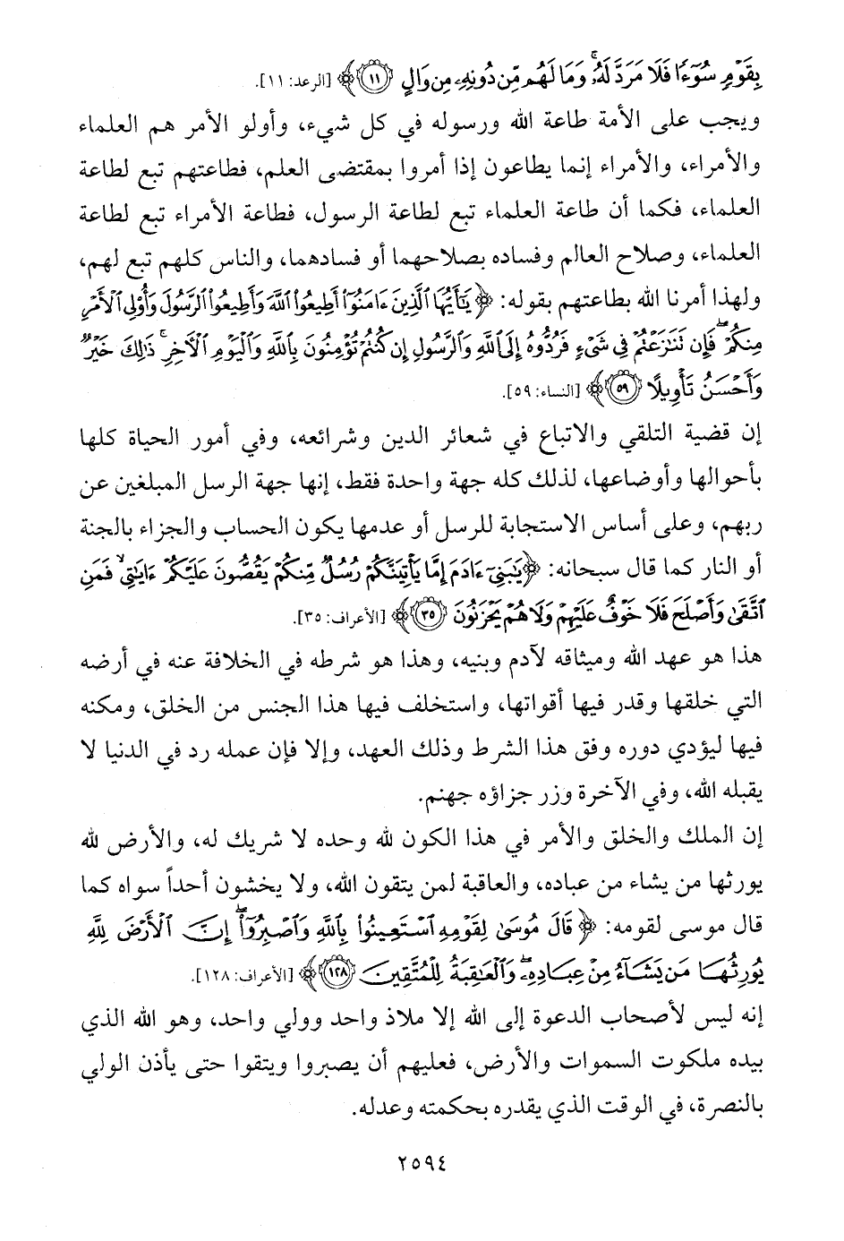 ويجب على الأمة طاعة الله ورسوله في كل شيء، وأولو الأمر هم العلماء والأمراء، والأمراء إنما يطاعون إذا أمروا بمقتضى العلم، فطاعتهم تبع لطاعة العلماء، فكما أن طاعة العلماء تبع لطاعة الرسول، فطاعة الأمراء تبع لطاعة العلماء، وصلاح العالم وفساده بصلاحهما أو فسادهما، والناس كلهم تبع لهم، ولهذا أمرنا الله بطاعتهم بقوله: {يَاأَيُّهَا الَّذِينَ آمَنُوا أَطِيعُوا اللَّهَ وَأَطِيعُوا الرَّسُولَ وَأُولِي الْأَمْرِ مِنْكُمْ فَإِنْ تَنَازَعْتُمْ فِي شَيْءٍ فَرُدُّوهُ إِلَى اللَّهِ وَالرَّسُولِ إِنْ كُنْتُمْ تُؤْمِنُونَ بِاللَّهِ وَالْيَوْمِ الْآخِرِ ذَلِكَ خَيْرٌ وَأَحْسَنُ تَأْوِيلًا (59)} [النساء: 59].