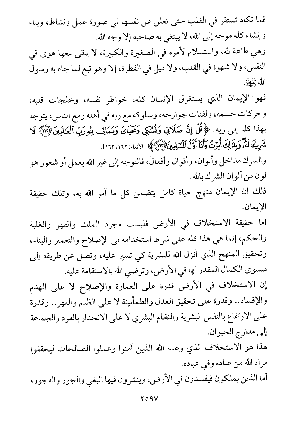 إن الاستخلاف في الأرض قدرة على العمارة والإصلاح لا على الهدم والإفساد .. وقدرة على تحقيق العدل والطمأنينة لا على الظلم والقهر .. وقدرة على الارتفاع بالنفس البشرية والنظام البشري لا على الانحدار بالفرد والجماعة إلى مدارج الحيوان.