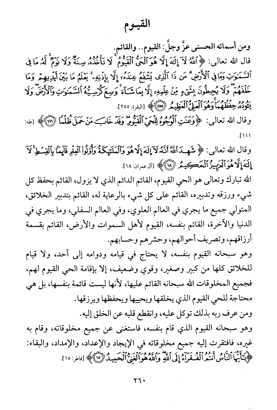وهو سبحانه القيوم بنفسه، لا يحتاج في قيامه ودوامه إلى أحد، ولا قيام للخلائق كلها من كبير وصغير، وقوي وضعيف، إلا بإقامة الحي القيوم لهم، فجميع المخلوقات الله سبحانه القائم عليها، لأنها ليست قائمة بنفسها، بل هي محتاجة للحي القيوم الذي يخلقها ويحييها ويحفظها ويرزقها.