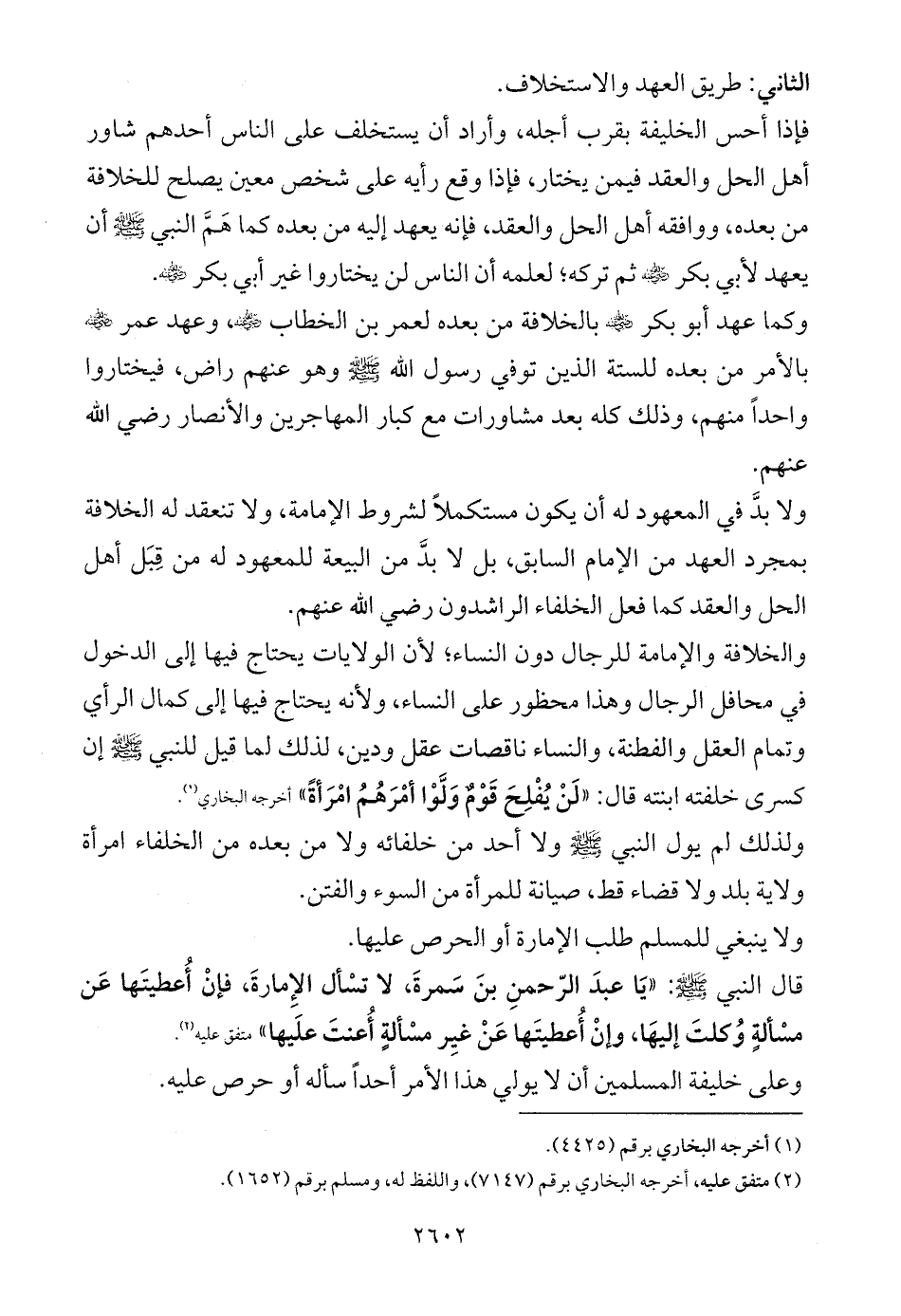 والخلافة والإمامة للرجال دون النساء؛ لأن الولايات يحتاج فيها إلى الدخول في محافل الرجال وهذا محظور على النساء، ولأنه يحتاج فيها إلى كمال الرأي وتمام العقل والفطنة، والنساء ناقصات عقل ودين، لذلك لما قيل للنبي - صلى الله عليه وسلم - إن كسرى خلفته ابنته قال: «لَنْ يُفْلِحَ قَوْمٌ وَلَّوْا أمْرَهُمُ امْرَأةً» أخرجه البخاري (¬1).