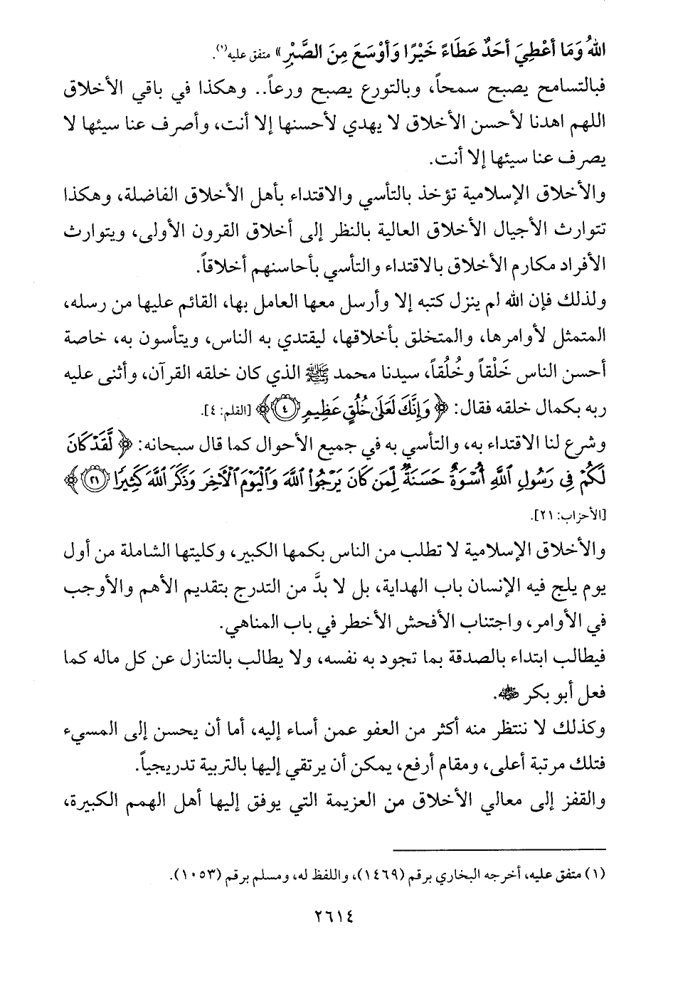 والأخلاق الإسلامية لا تطلب من الناس بكمها الكبير، وكليتها الشاملة من أول يوم يلج فيه الإنسان باب الهداية، بل لا بدَّ من التدرج بتقديم الأهم والأوجب في الأوامر، واجتناب الأفحش الأخطر في باب المناهي.
