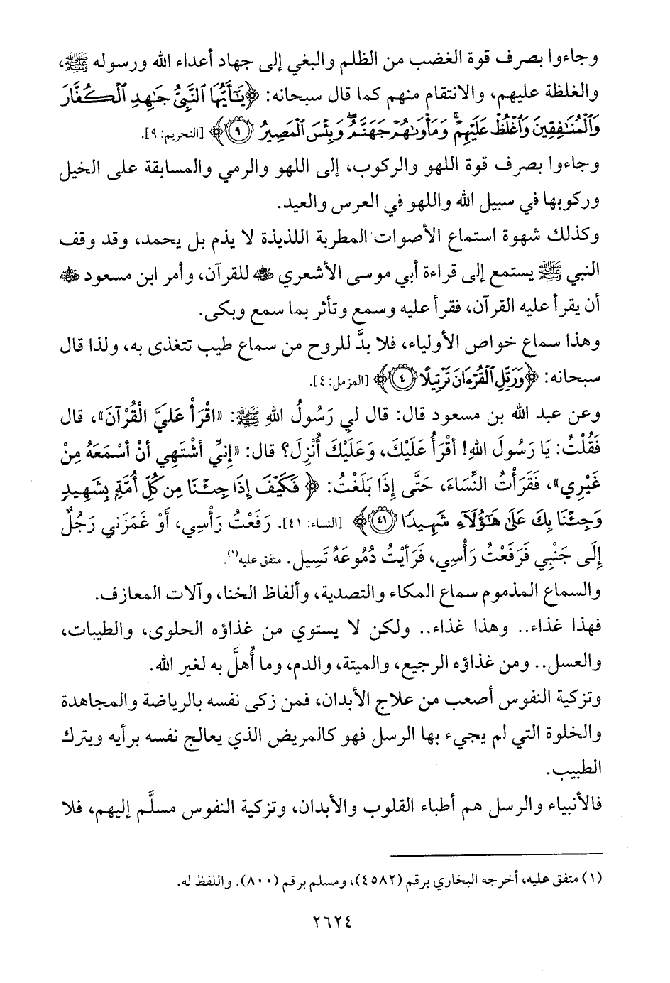 وكذلك شهوة استماع الأصوات المطربة اللذيذة لا يذم بل يحمد، وقد وقف النبي - صلى الله عليه وسلم - يستمع إلى قراءة أبي موسى الأشعري - رضي الله عنه - للقرآن، وأمر ابن مسعود - رضي الله عنه - أن يقرأ عليه القرآن، فقرأ عليه وسمع وتأثر بما سمع وبكى.