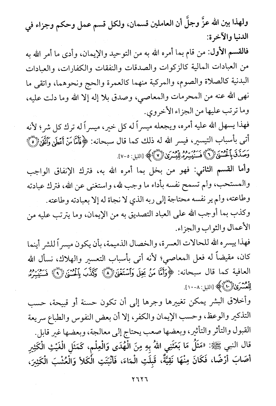 ولهذا بين الله عزَّ وجلَّ أن العاملين قسمان، ولكل قسم عمل وحكم وجزاء في الدنيا والآخرة: