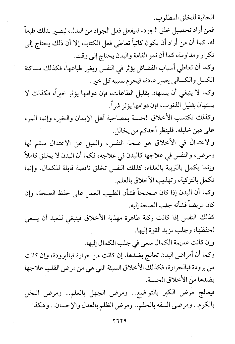 والاعتدال في الأخلاق هو صحة النفس، والميل عن الاعتدال سقم لها ومرض، والنفس في علاجها كالبدن في علاجه، فكما أن البدن لا يخلق كاملاً وإنما يكمل بالتربية بالغذاء، كذلك النفس تخلق ناقصة قابلة للكمال، وإنما تكمل بالتزكية، وتهذيب الأخلاق بالعلم.