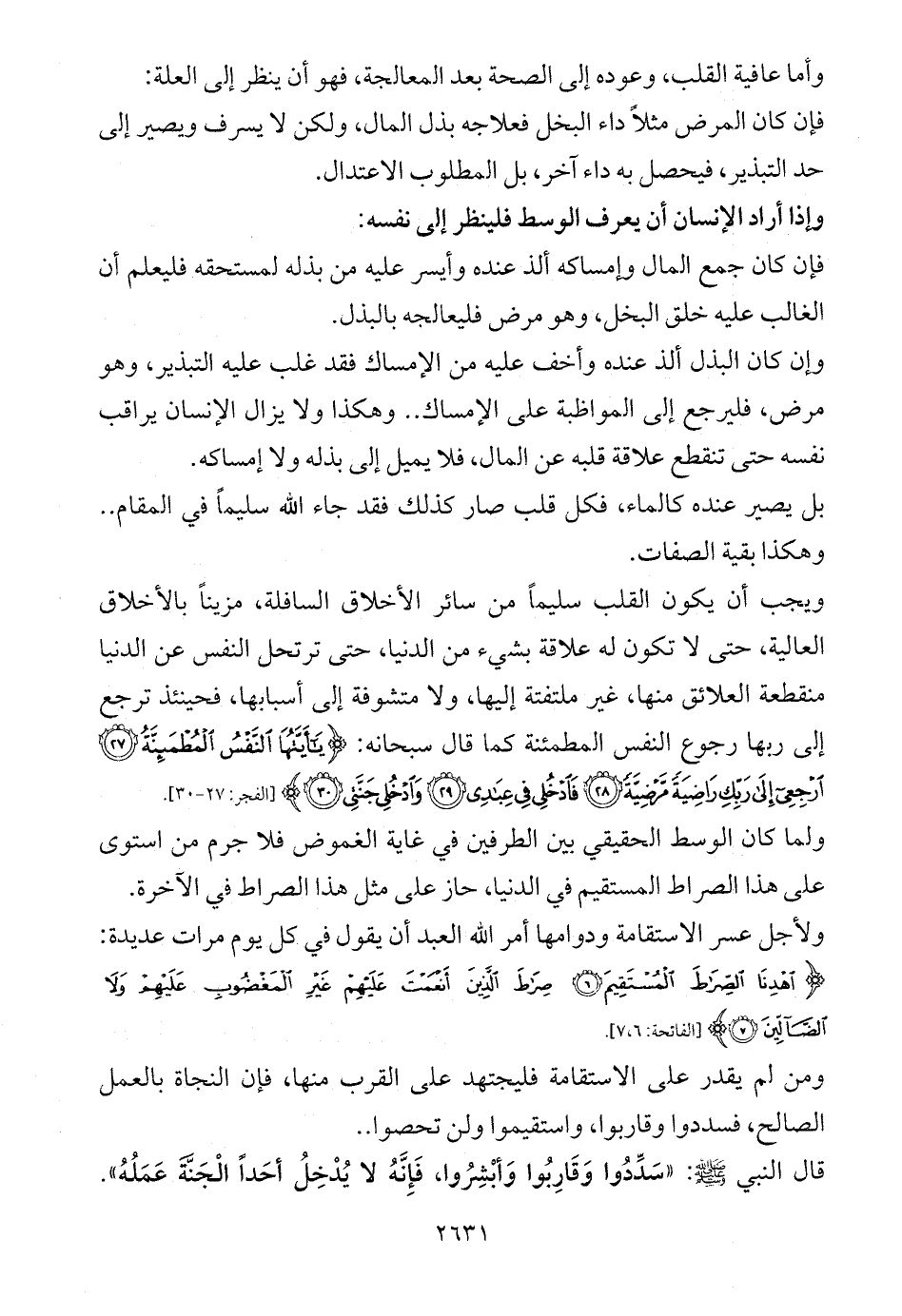 ويجب أن يكون القلب سليماً من سائر الأخلاق السافلة، مزيناً بالأخلاق العالية، حتى لا تكون له علاقة بشيء من الدنيا، حتى ترتحل النفس عن الدنيا منقطعة العلائق منها، غير ملتفتة إليها، ولا متشوفة إلى أسبابها، فحينئذ ترجع إلى ربها رجوع النفس المطمئنة كما قال سبحانه: {يَاأَيَّتُهَا النَّفْسُ الْمُطْمَئِنَّةُ (27) ارْجِعِي إِلَى رَبِّكِ رَاضِيَةً مَرْضِيَّةً (28) فَادْخُلِي فِي عِبَادِي (29) وَادْخُلِي جَنَّتِي (30)} [الفجر: 27 - 30].