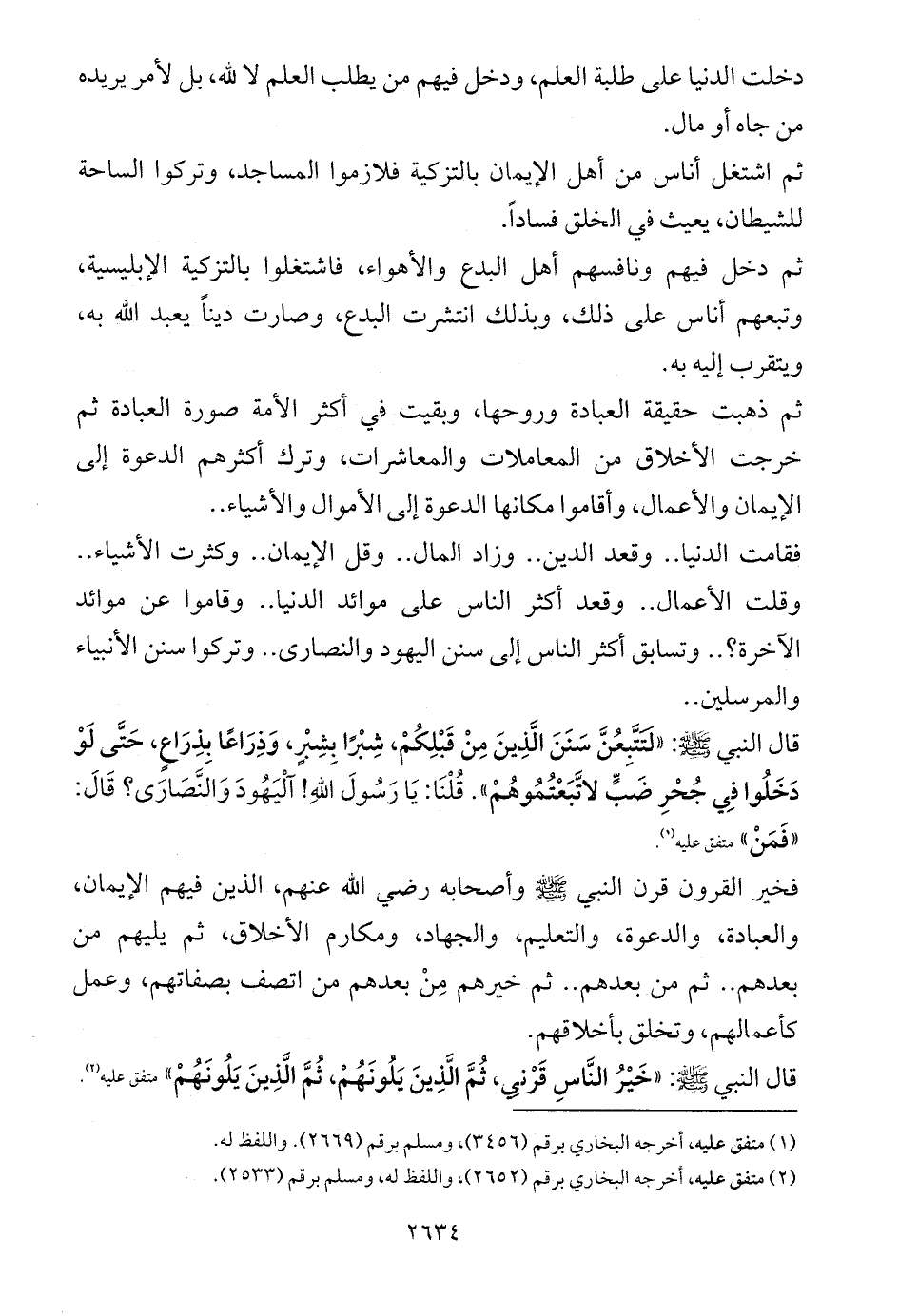 قال النبي - صلى الله عليه وسلم -: «لَتَتَّبِعُنَّ سَنَنَ الَّذِينَ مِنْ قَبْلِكُمْ، شِبْرًا بِشِبْرٍ، وَذِرَاعًا بِذِرَاعٍ، حَتَّى لَوْ دَخَلُوا فِي جُحْرِ ضَبٍّ لاتَّبَعْتُمُوهُمْ». قُلْنَا: يَا رَسُولَ اللهِ! آلْيَهُودَ وَالنَّصَارَى؟ قَالَ: «فَمَنْ» متفق عليه (¬1).