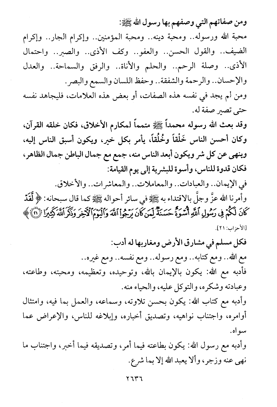 وأدبه مع رسول الله: يكون بطاعته فيما أمر، وتصديقه فيما أخبر، واجتناب ما نهى عنه وزجر، وألا يعبد الله إلا بما شرع.