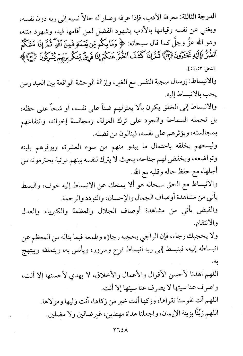 الدرجة الثالثة: معرفة الأدب، فإذا عرفه وصار له حالاً نسبه إلى ربه دون نفسه، ويغني عن نفسه وقيامها بالأدب بشهود الفضل لمن أقامها فيه، وشهود منته، وهو الله عزَّ وجلَّ كما قال سبحانه: {وَمَا بِكُمْ مِنْ نِعْمَةٍ فَمِنَ اللَّهِ ثُمَّ إِذَا مَسَّكُمُ الضُّرُّ فَإِلَيْهِ تَجْأَرُونَ (53) ثُمَّ إِذَا كَشَفَ الضُّرَّ عَنْكُمْ إِذَا فَرِيقٌ مِنْكُمْ بِرَبِّهِمْ يُشْرِكُونَ (54)} [النحل: 53،54].