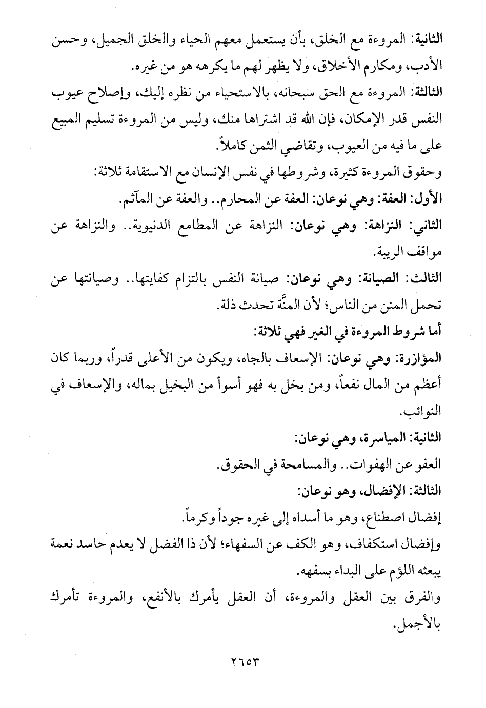 وحقوق المروءة كثيرة، وشروطها في نفس الإنسان مع الاستقامة ثلاثة: