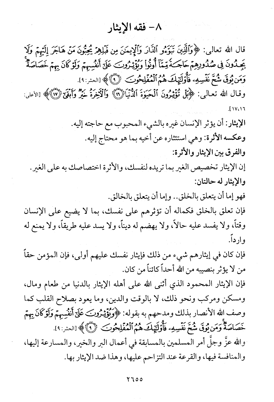 فإن الإيثار المحمود الذي أثنى الله على أهله الإيثار بالدنيا من طعام ومال، ومسكن ومركب ونحو ذلك، لا بالوقت والدين، وما يعود بصلاح القلب كما وصف الله الأنصار بذلك ومدحهم به بقوله: {وَيُؤْثِرُونَ عَلَى أَنْفُسِهِمْ وَلَوْ كَانَ بِهِمْ خَصَاصَةٌ وَمَنْ يُوقَ شُحَّ نَفْسِهِ فَأُولَئِكَ هُمُ الْمُفْلِحُونَ (9)} [الحشر: 9].
