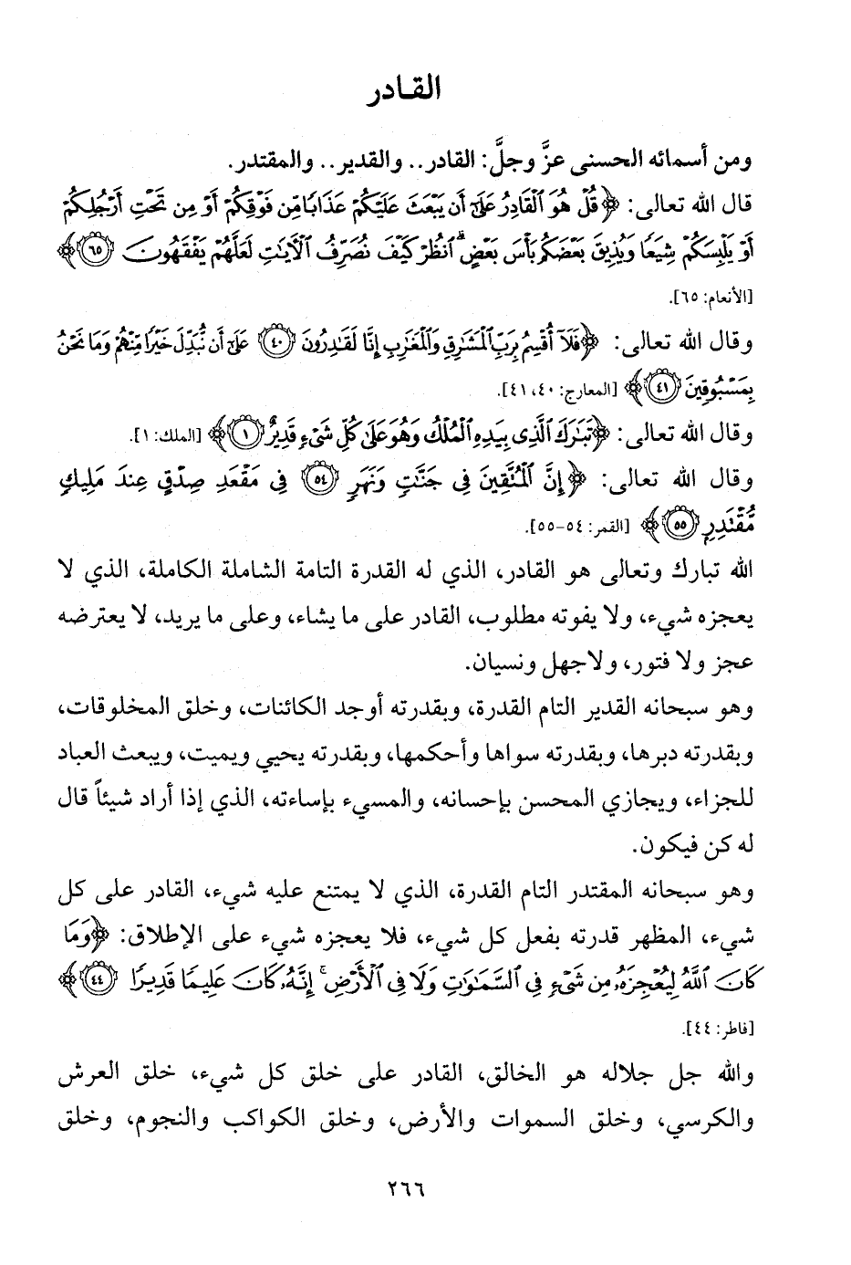 وهو سبحانه القدير التام القدرة، وبقدرته أوجد الكائنات، وخلق المخلوقات، وبقدرته دبرها، وبقدرته سواها وأحكمها، وبقدرته يحيي ويميت، ويبعث العباد للجزاء، ويجازي المحسن بإحسانه، والمسيء بإساءته، الذي إذا أراد شيئاً قال له كن فيكون.
