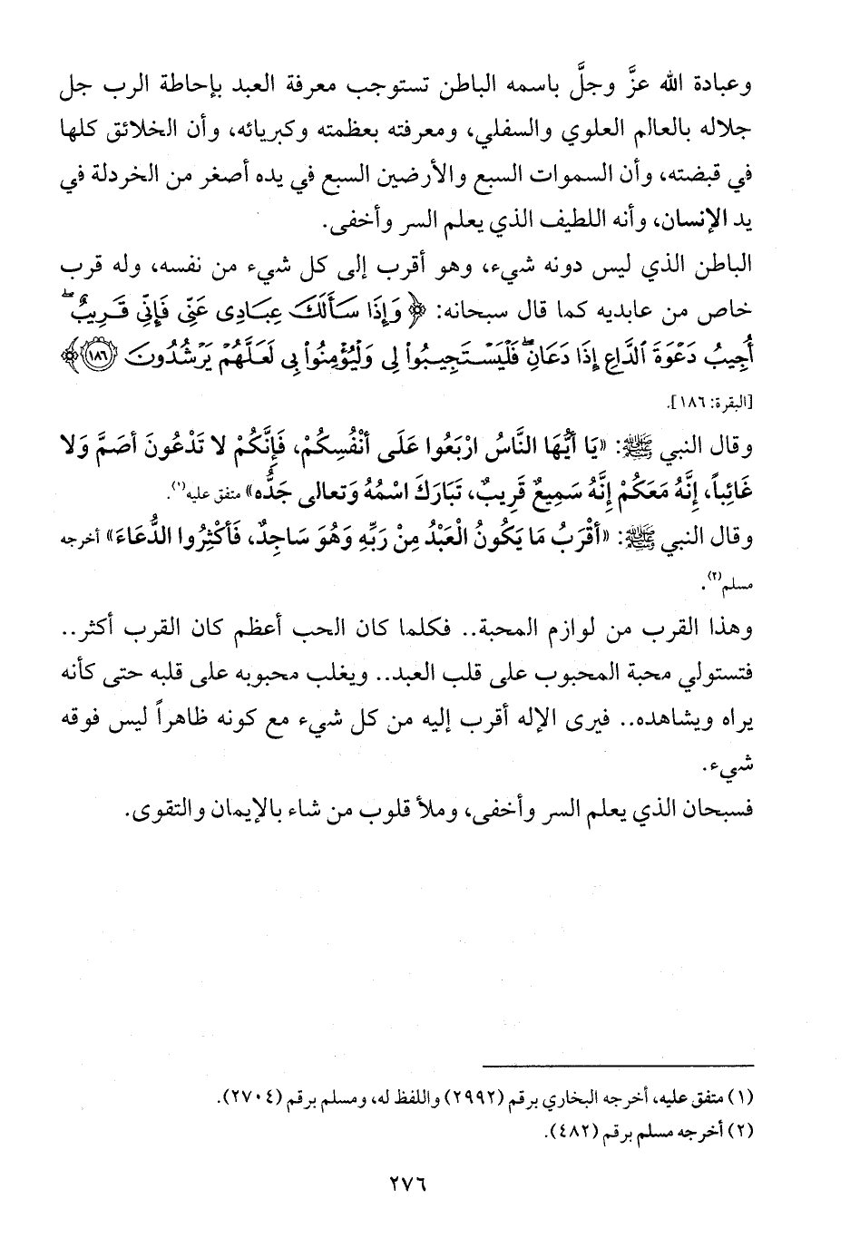 وقال النبي - صلى الله عليه وسلم -: «يَا أيُّهَا النَّاسُ ارْبَعُوا عَلَى أنْفُسِكُمْ، فَإِنَّكُمْ لا تَدْعُونَ أصَمَّ وَلا غَائِباً، إِنَّهُ مَعَكُمْ إِنَّهُ سَمِيعٌ قَرِيبٌ، تَبَارَكَ اسْمُهُ وَتعالى جَدُّه» متفق عليه (¬1).