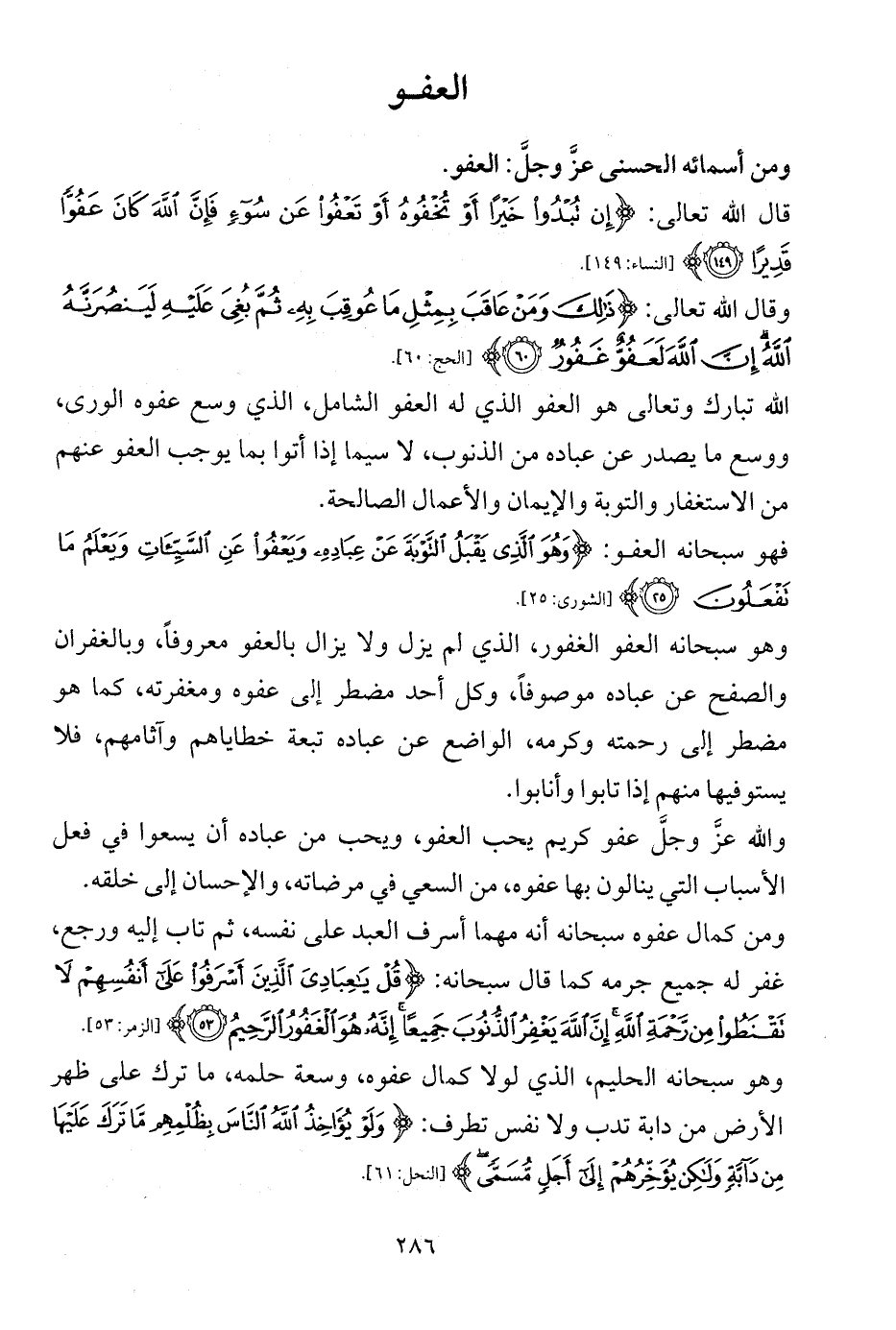 وهو سبحانه العفو الغفور، الذي لم يزل ولا يزال بالعفو معروفاً، وبالغفران والصفح عن عباده موصوفاً، وكل أحد مضطر إلى عفوه ومغفرته، كما هو مضطر إلى رحمته وكرمه، الواضع عن عباده تبعة خطاياهم وآثامهم، فلا يستوفيها منهم إذا تابوا وأنابوا.