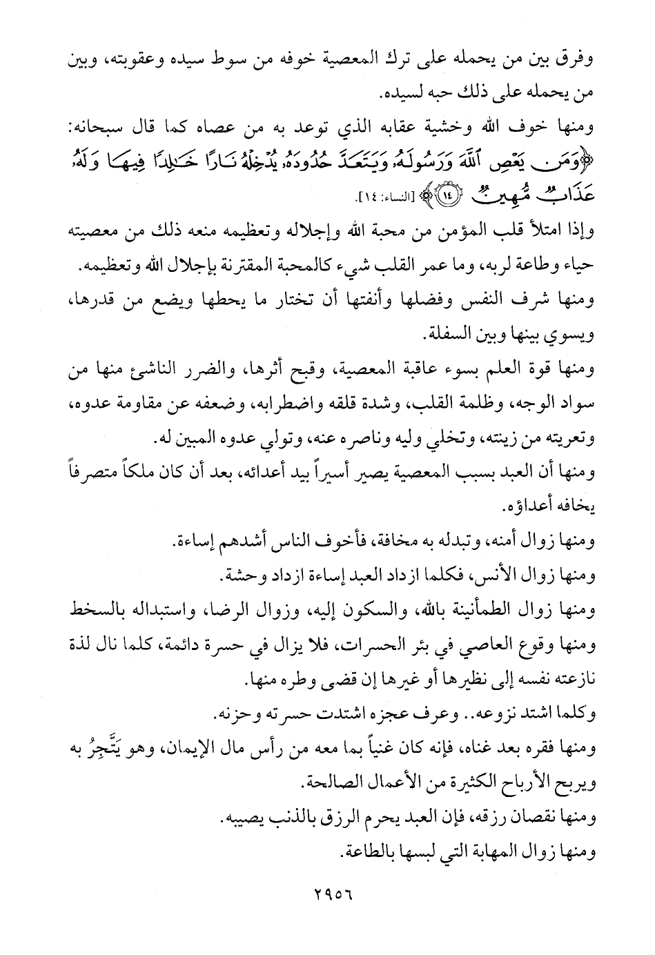 ومنها قوة العلم بسوء عاقبة المعصية، وقبح أثرها، والضرر الناشئ منها من سواد الوجه، وظلمة القلب، وشدة قلقه واضطرابه، وضعفه عن مقاومة عدوه، وتعريته من زينته، وتخلي وليه وناصره عنه، وتولي عدوه المبين له.