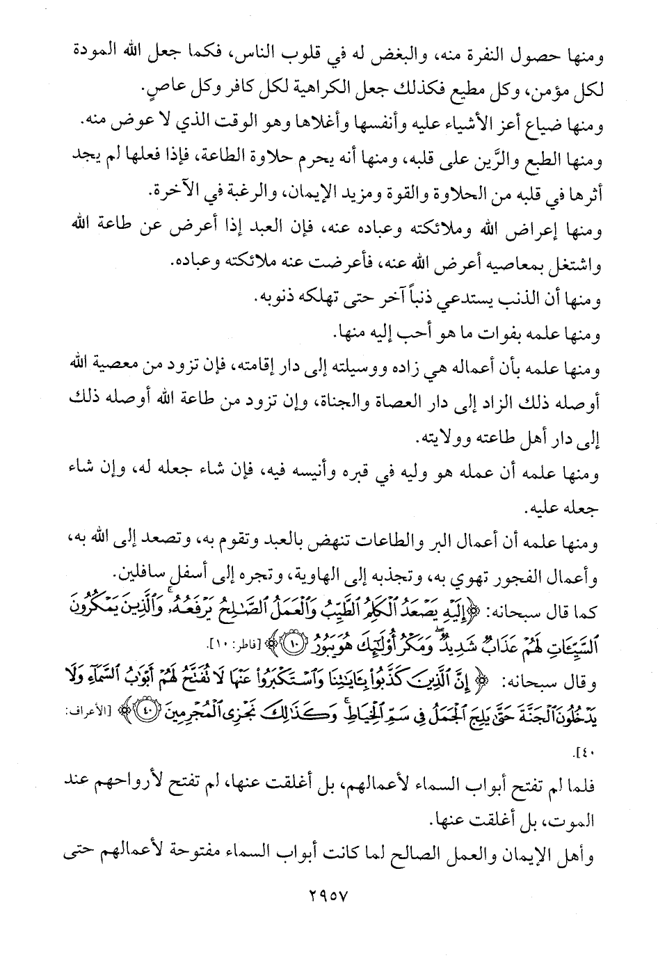 ومنها علمه أن أعمال البر والطاعات تنهض بالعبد وتقوم به، وتصعد إلى الله به، وأعمال الفجور تهوي به، وتجذبه إلى الهاوية، وتجره إلى أسفل سافلين.