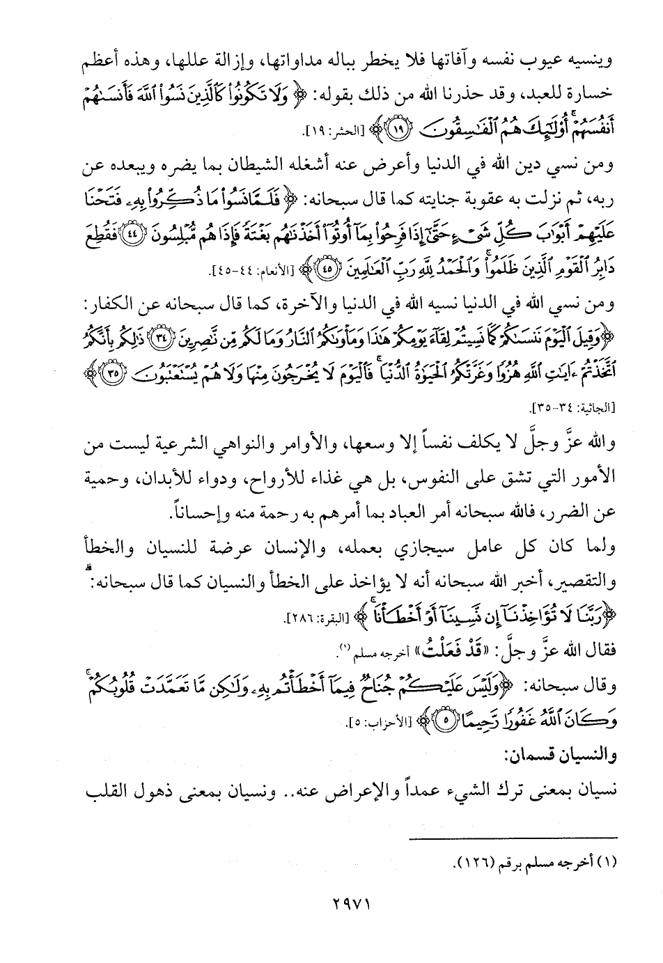 وينسيه عيوب نفسه وآفاتها فلا يخطر بباله مداواتها، وإزالة عللها، وهذه أعظم خسارة للعبد، وقد حذرنا الله من ذلك بقوله: {وَلَا تَكُونُوا كَالَّذِينَ نَسُوا اللَّهَ فَأَنْسَاهُمْ أَنْفُسَهُمْ أُولَئِكَ هُمُ الْفَاسِقُونَ (19)} [الحشر: 19].