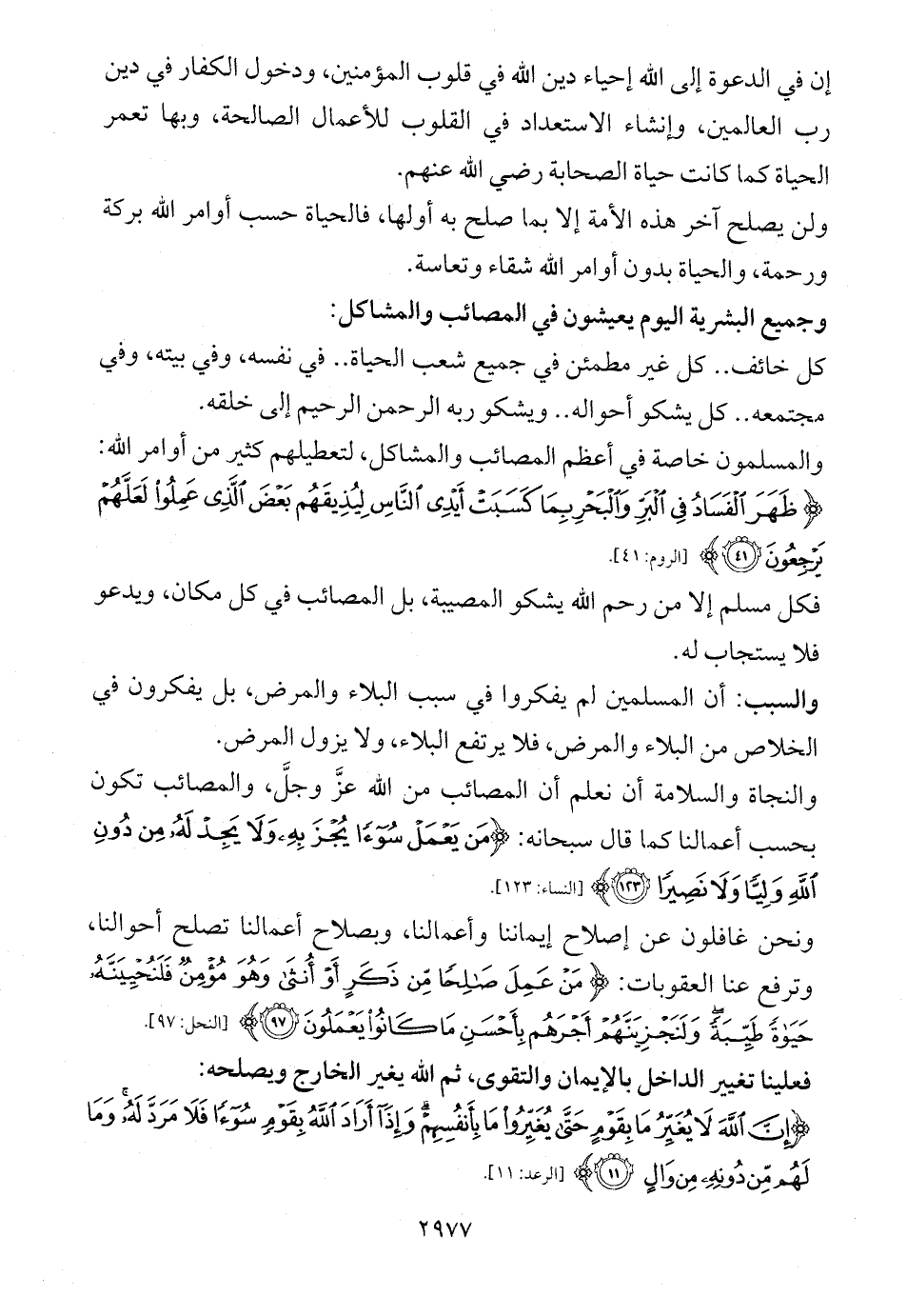 والمسلمون خاصة في أعظم المصائب والمشاكل، لتعطيلهم كثير من أوامر الله: {ظَهَرَ الْفَسَادُ فِي الْبَرِّ وَالْبَحْرِ بِمَا كَسَبَتْ أَيْدِي النَّاسِ لِيُذِيقَهُمْ بَعْضَ الَّذِي عَمِلُوا لَعَلَّهُمْ يَرْجِعُونَ (41)} [الروم: 41].